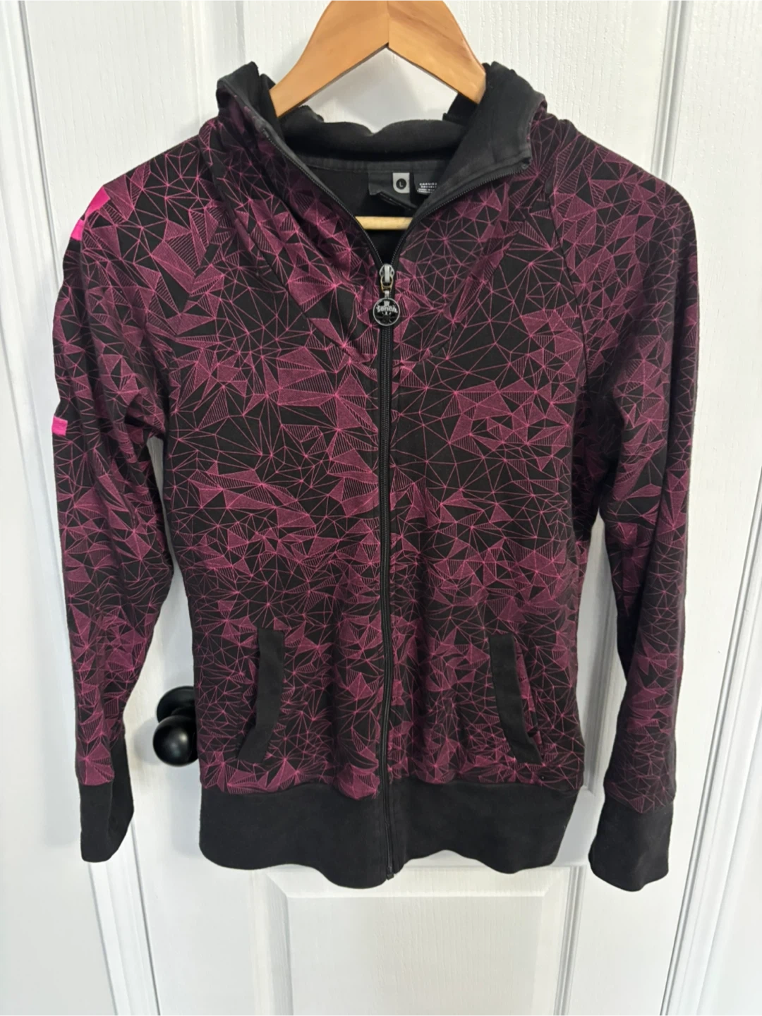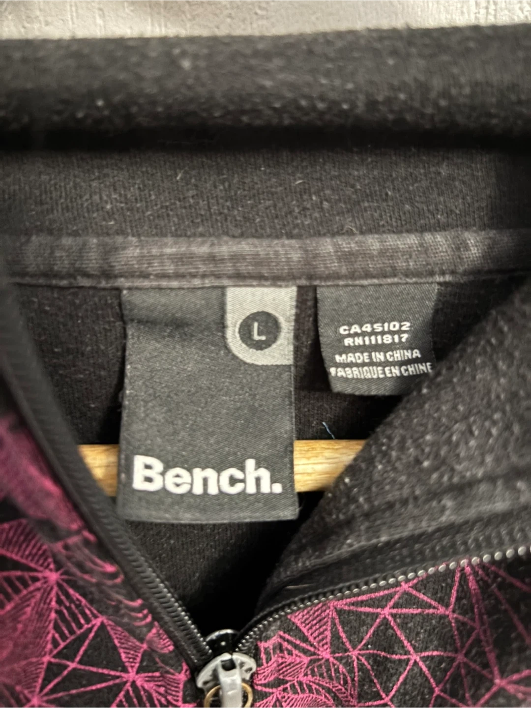 Bench hoodie in size large! It's a full zip hoodie with a cool geometric pattern in black and pink. The Bench logo is also featured prominently on the sleeve