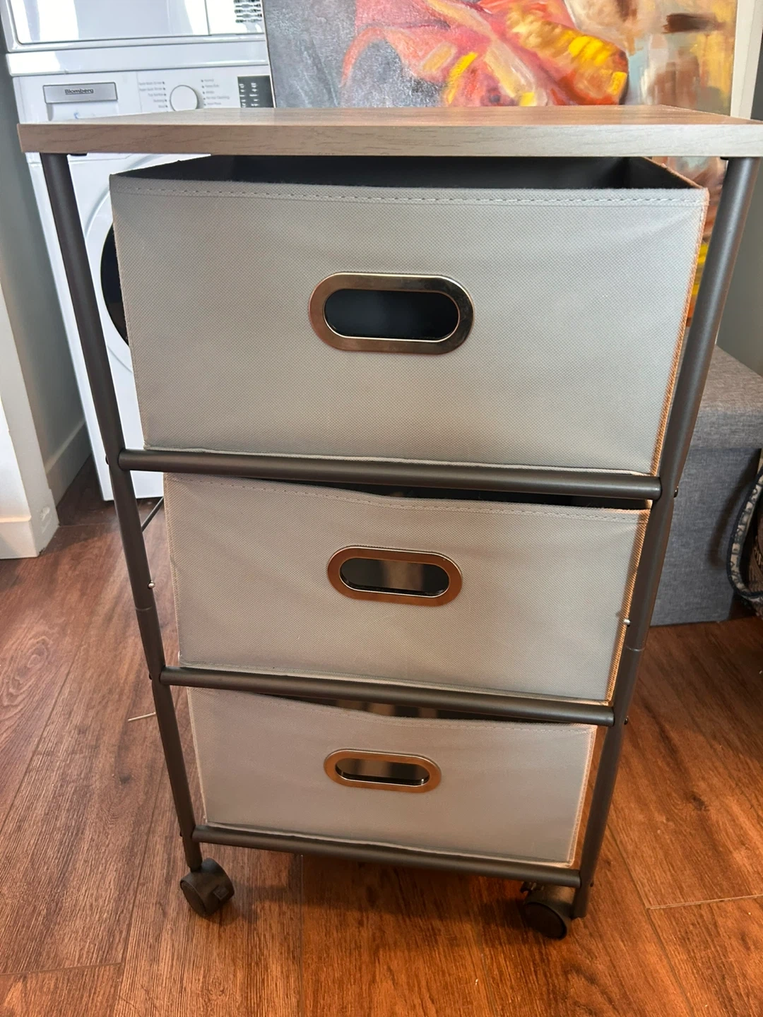 This rolling storage cart is perfect for adding extra storage to any room! It features three drawers, each with a metal handle. The cart has a sturdy metal frame and smooth-rolling casters for easy mobility