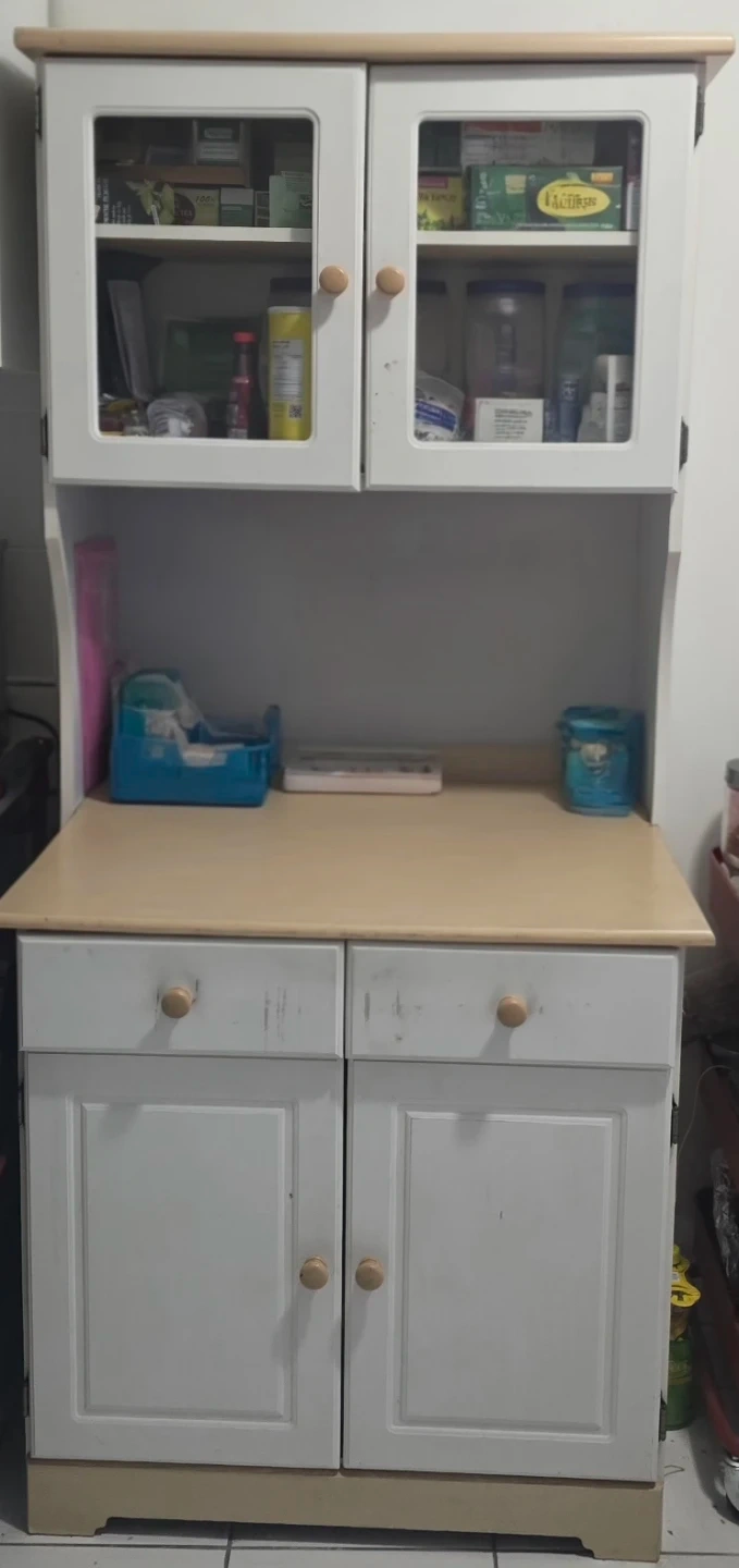 Selling a white hutch with glass cabinets. It has some wear and tear on the drawers, but it's still a functional piece of furniture for storage and display