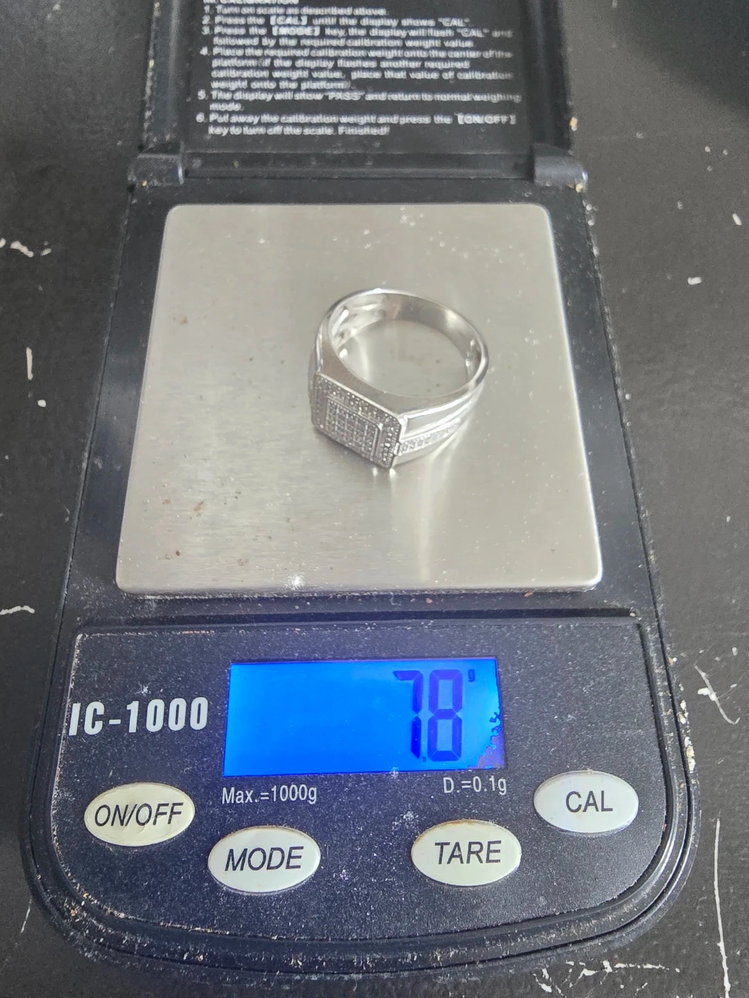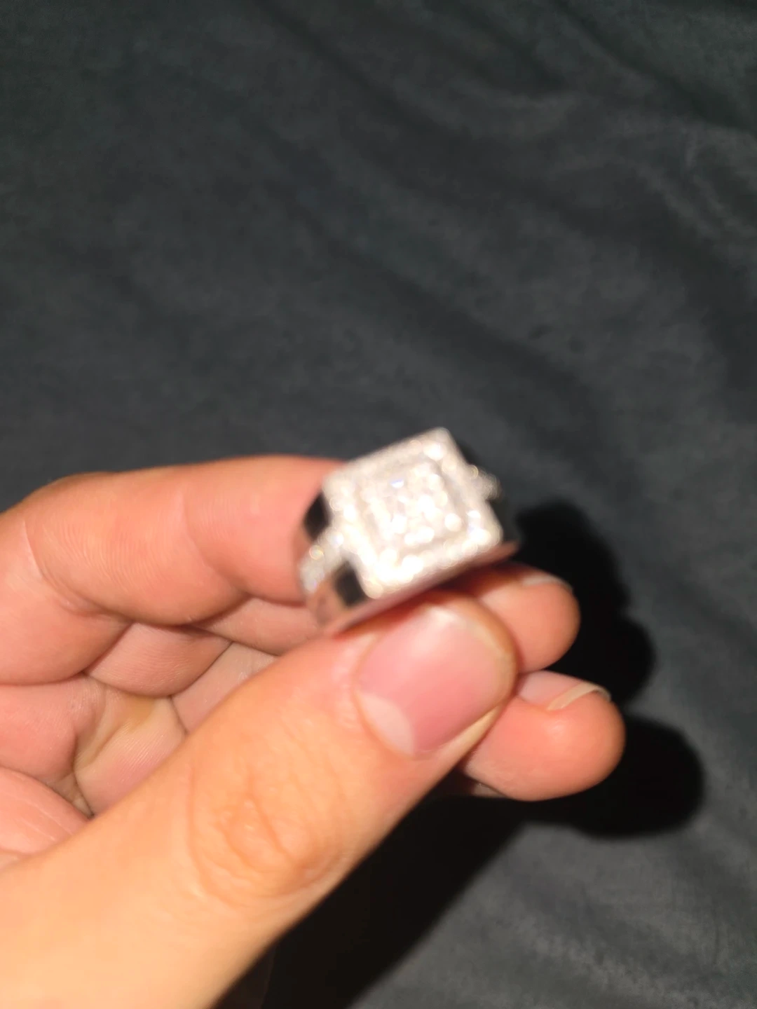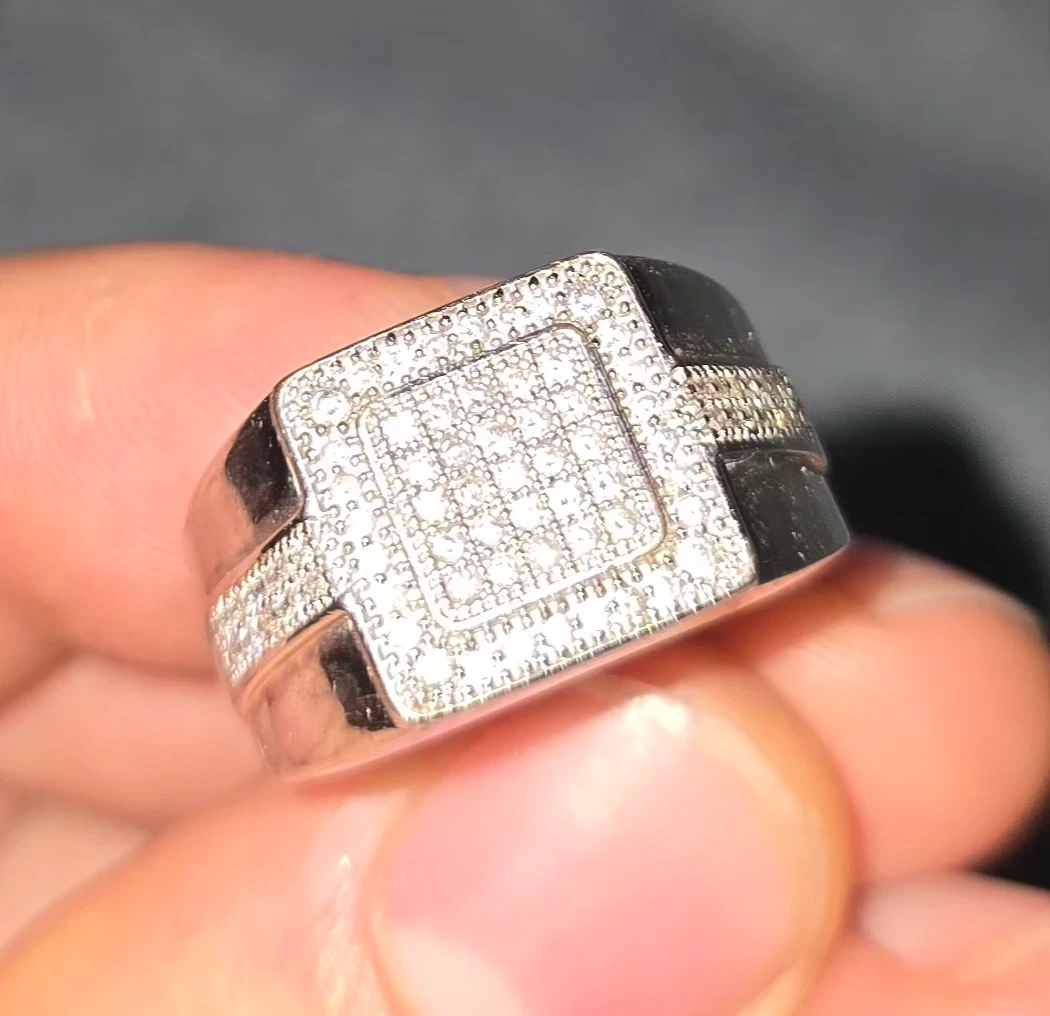 Here's a men's white gold ring, featuring a square face adorned with diamonds. It's in great condition and ready for a new home!