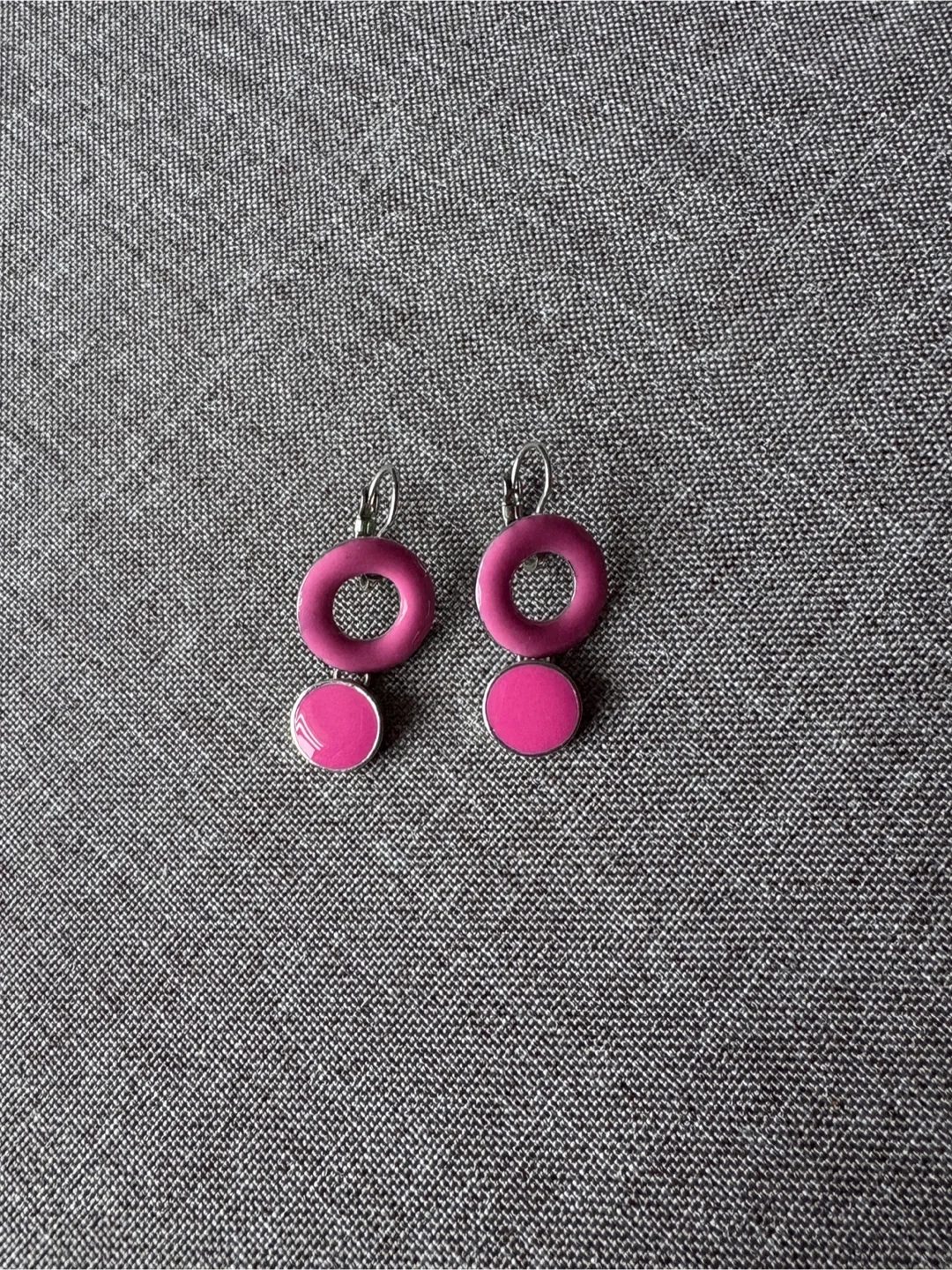 Here's a cute matching necklace and earring set! The set is a bright pink colour with a silver-tone chain and earring hooks. Perfect for adding a pop of colour to any outfit!