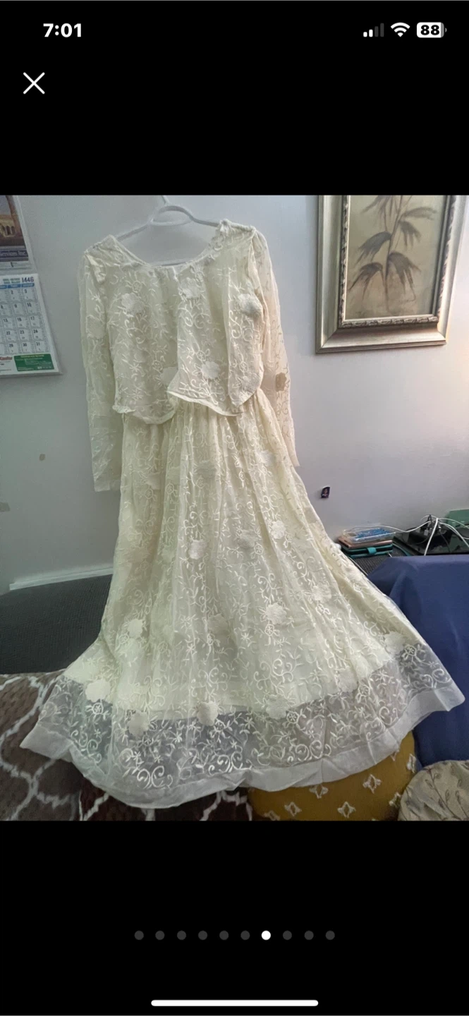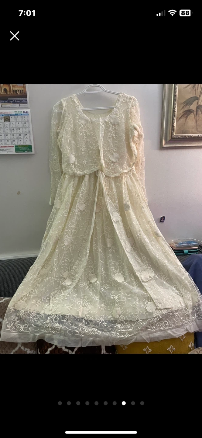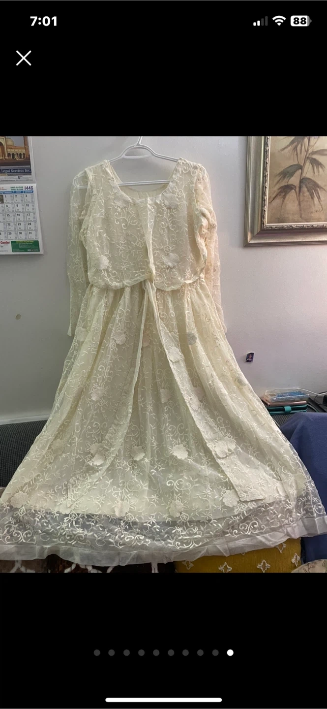 I have a couple of ladies' dresses for sale. One is a beautiful white lace dress, perfect for a special occasion. The other is a colourful floral dress, size 40, great for adding a pop of colour to your wardrobe 12 years print one brand new $30 . Off white one lace fully embroidery works with soft net fabric medium size 14/16 years old $35 pick up at Markham and Lawrence avenue east no drop off check out my other listings please.