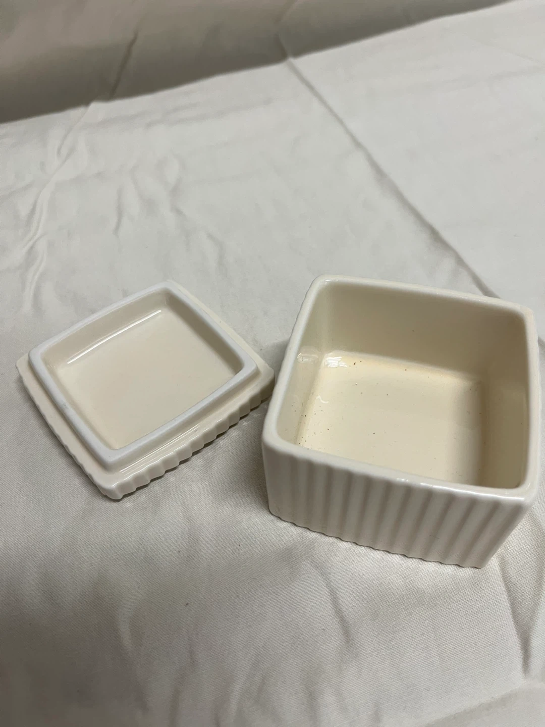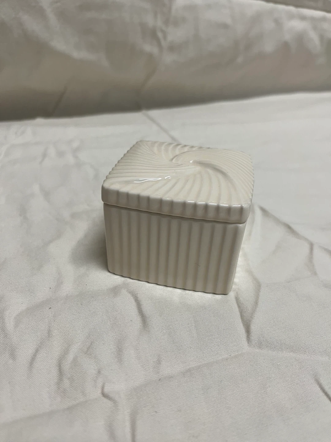 Selling a cute little cream-colored ceramic trinket box from Avon! It's perfect for storing small jewelry or other little treasures. The box has a lovely swirl design on the lid and a ribbed texture on the sides