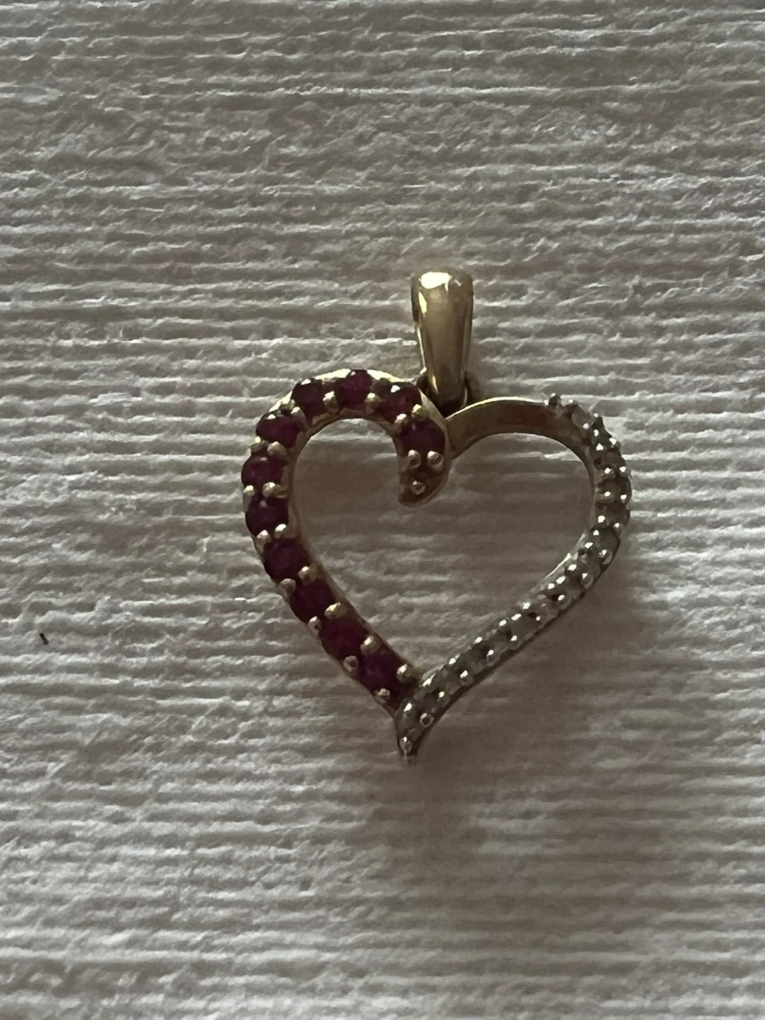 A beautiful heart-shaped pendant featuring both rubies and diamonds. The pendant is made of 10K gold and would be a lovely addition to any jewelry collection