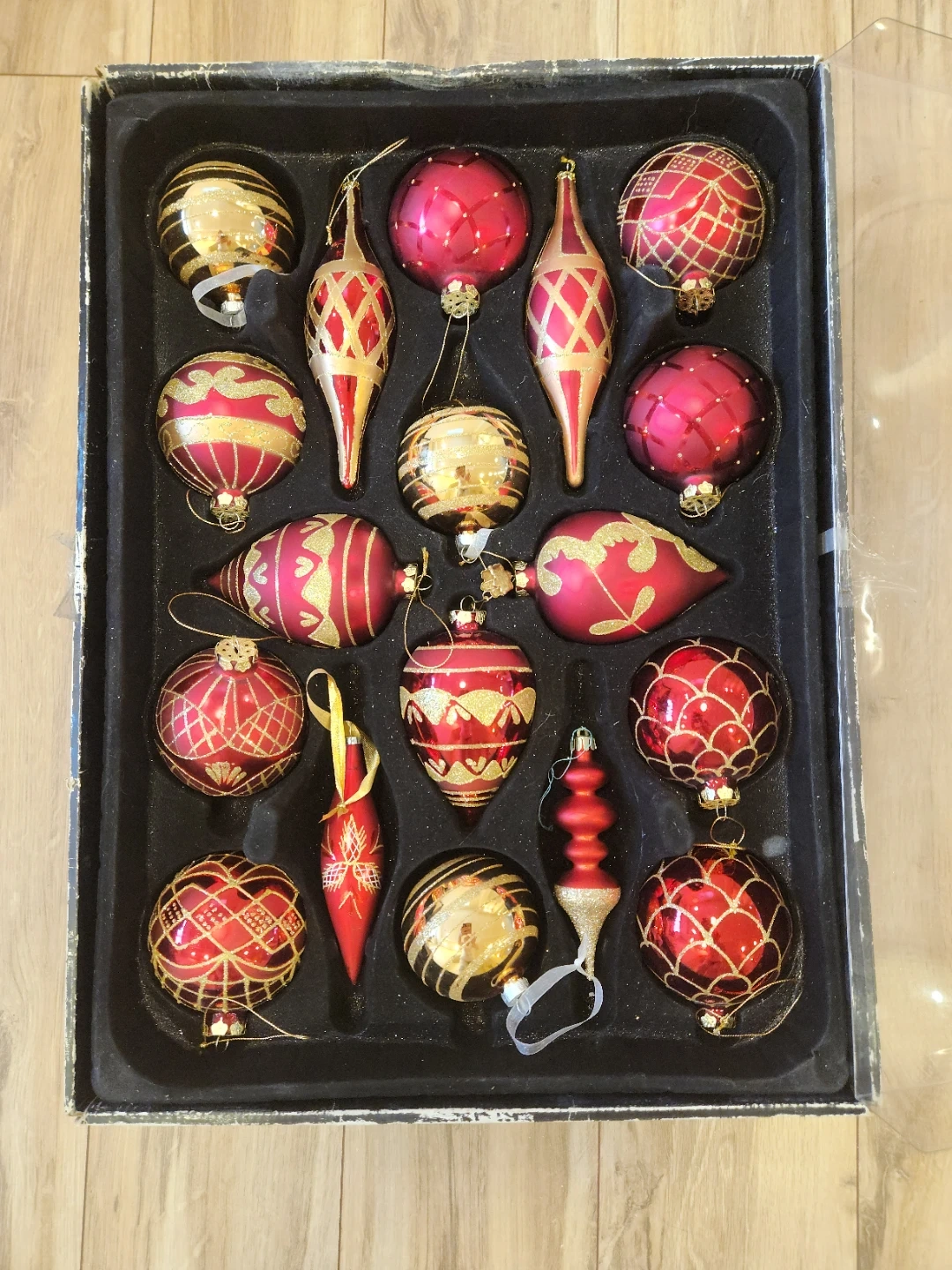 A lovely set of GLASS red and gold Christmas ornaments, perfect for adding a touch of festive cheer to your tree this holiday season! They come in a variety of shapes and sizes.