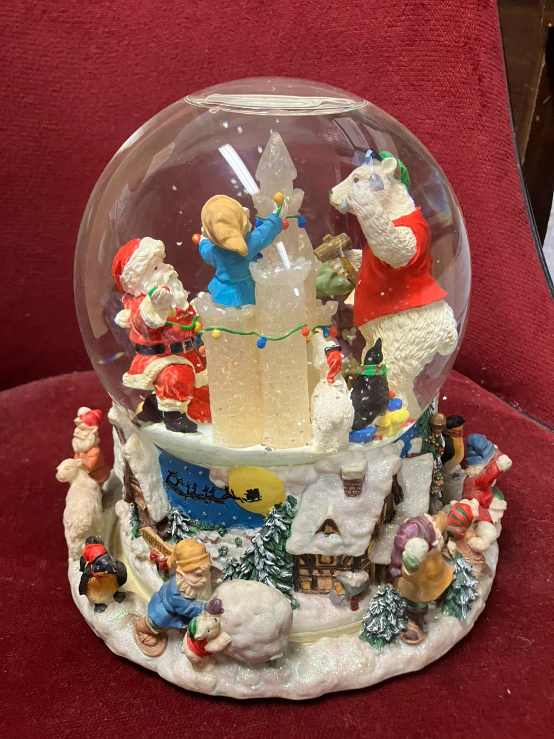 A charming Christmas snow globe featuring Santa Claus, a polar bear, and other festive figures! It's a delightful addition to any holiday decor