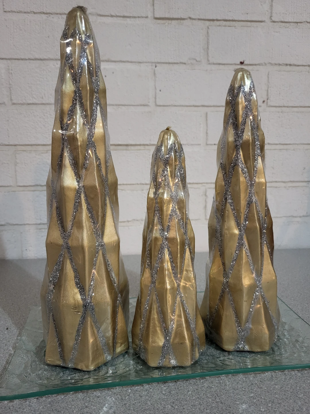 Selling a set of three, Vintage, gold Christmas tree-shaped candles. They have a glittery silver diamond pattern. Perfect for adding a festive touch to your home this holiday season!