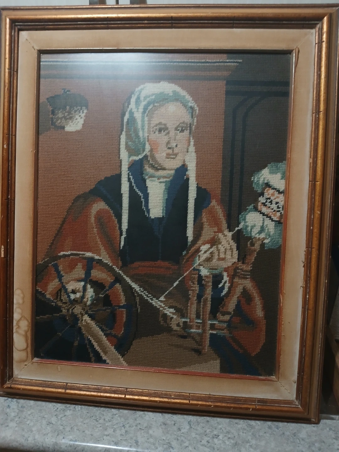 3 Beautiful framed needlepoint art featuring a lovely floral arrangement. A beautiful lady and an old woman . They are in great condition for the age