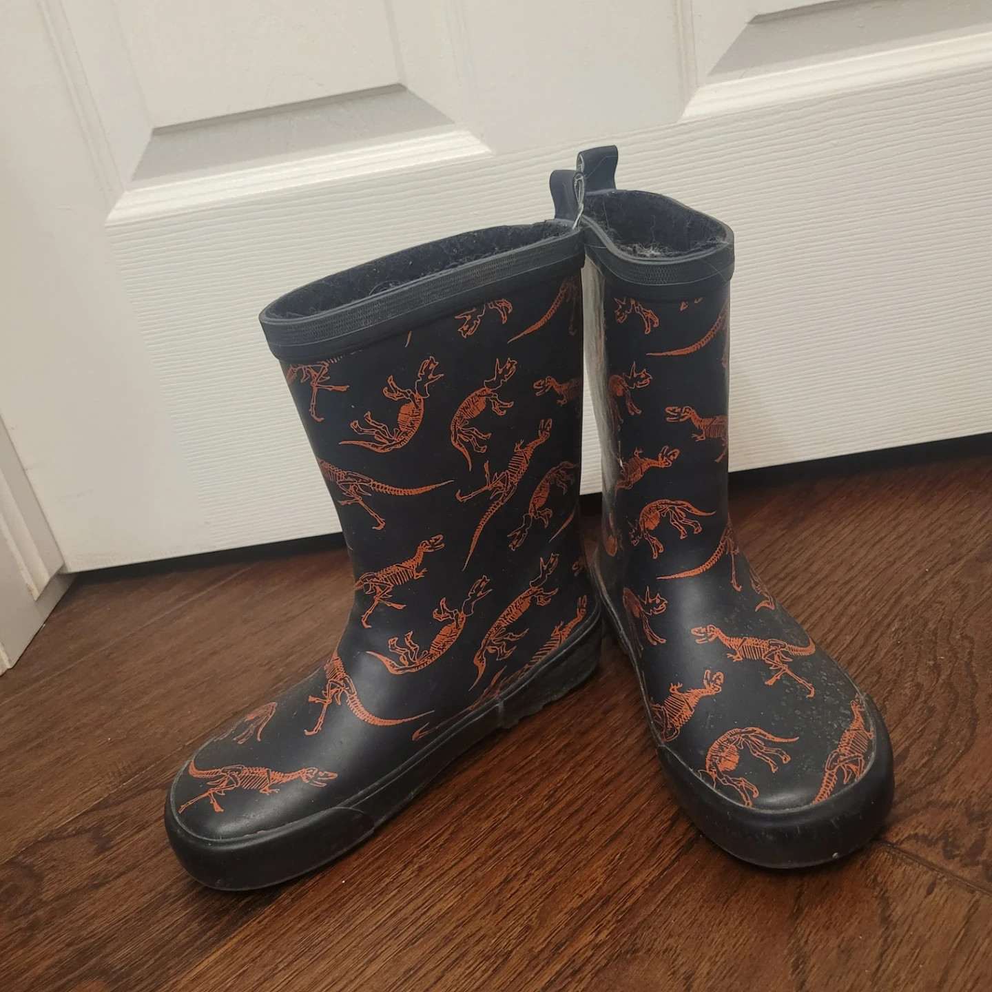 Cute rain boots with a fun dinosaur skeleton print! Perfect for puddle jumping and keeping little feet dry on rainy days. Size 2