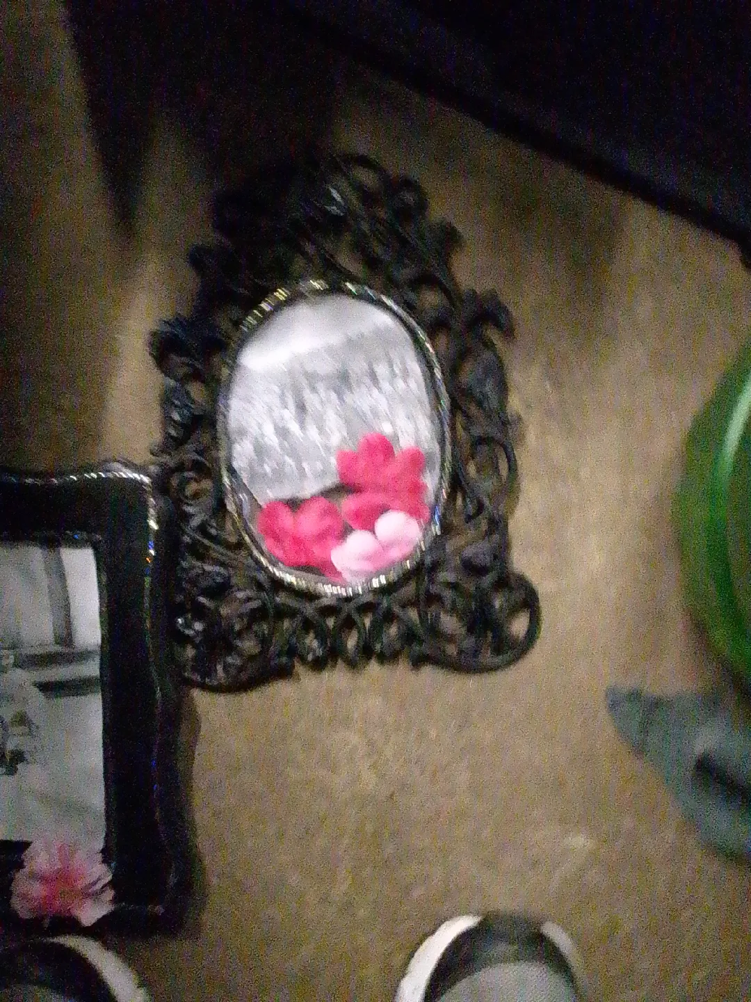 Selling a piece of ornate framed artwork. It features a decorative dark frame with a small picture inside. It would look great as part of a gallery wall or on a shelf!