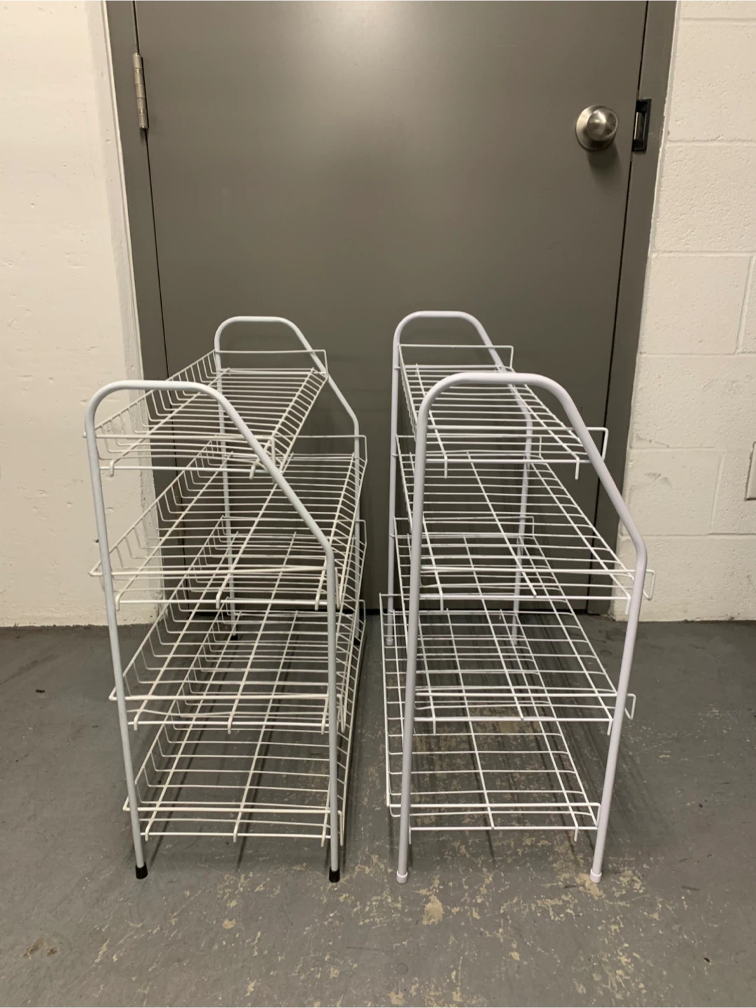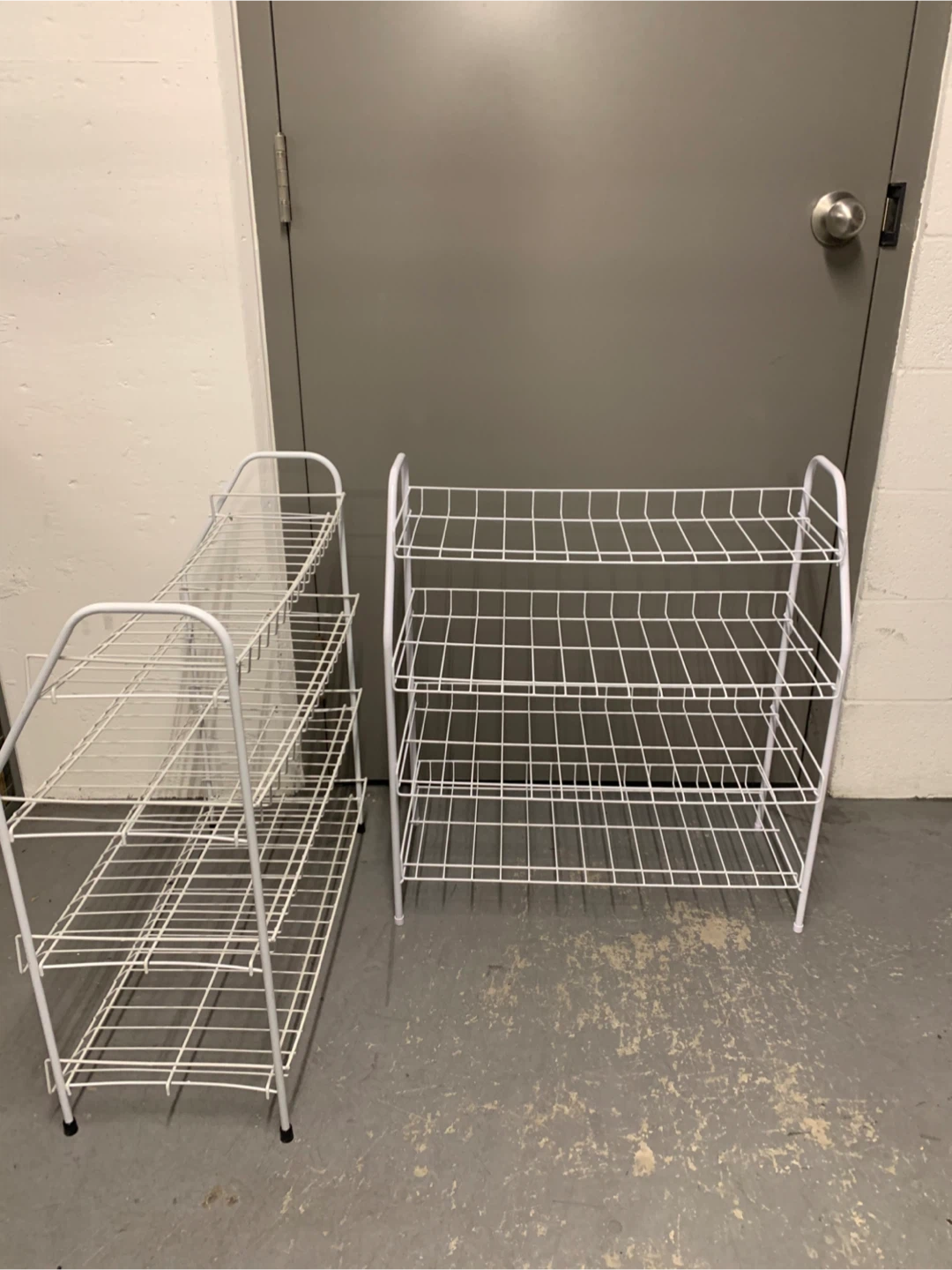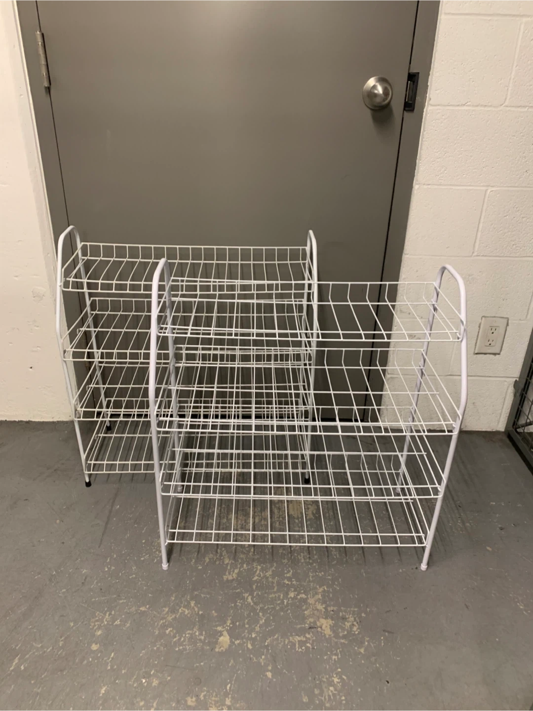 Selling two white wire shoe racks. These are great for organizing your shoes and keeping them off the floor. They're in good condition and ready for a new home! Easily dismantle for transportation.