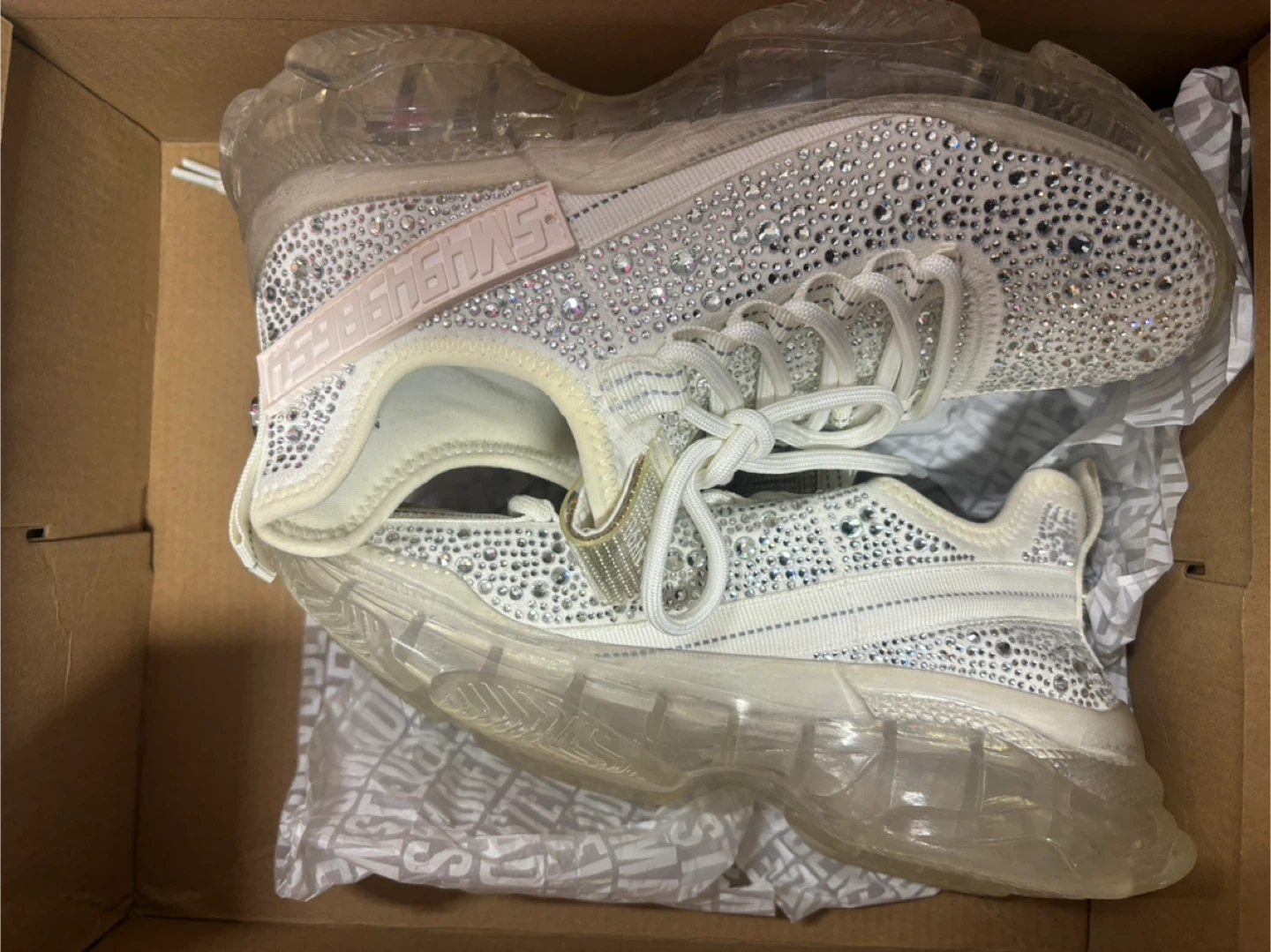 New never used Selling a pair of Steve Madden sneakers in size 6 They're the White Multi Rhinestone colour. Comes with the original box!