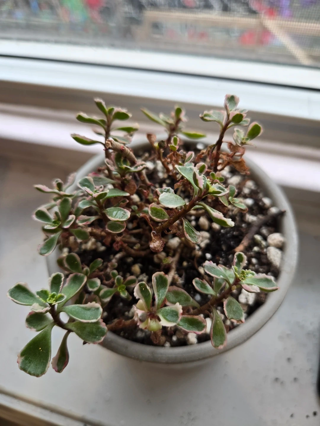 I'm selling a potted plant. It's in a ceramic pot with a diamond pattern. The plant has small green leaves with pink edges.