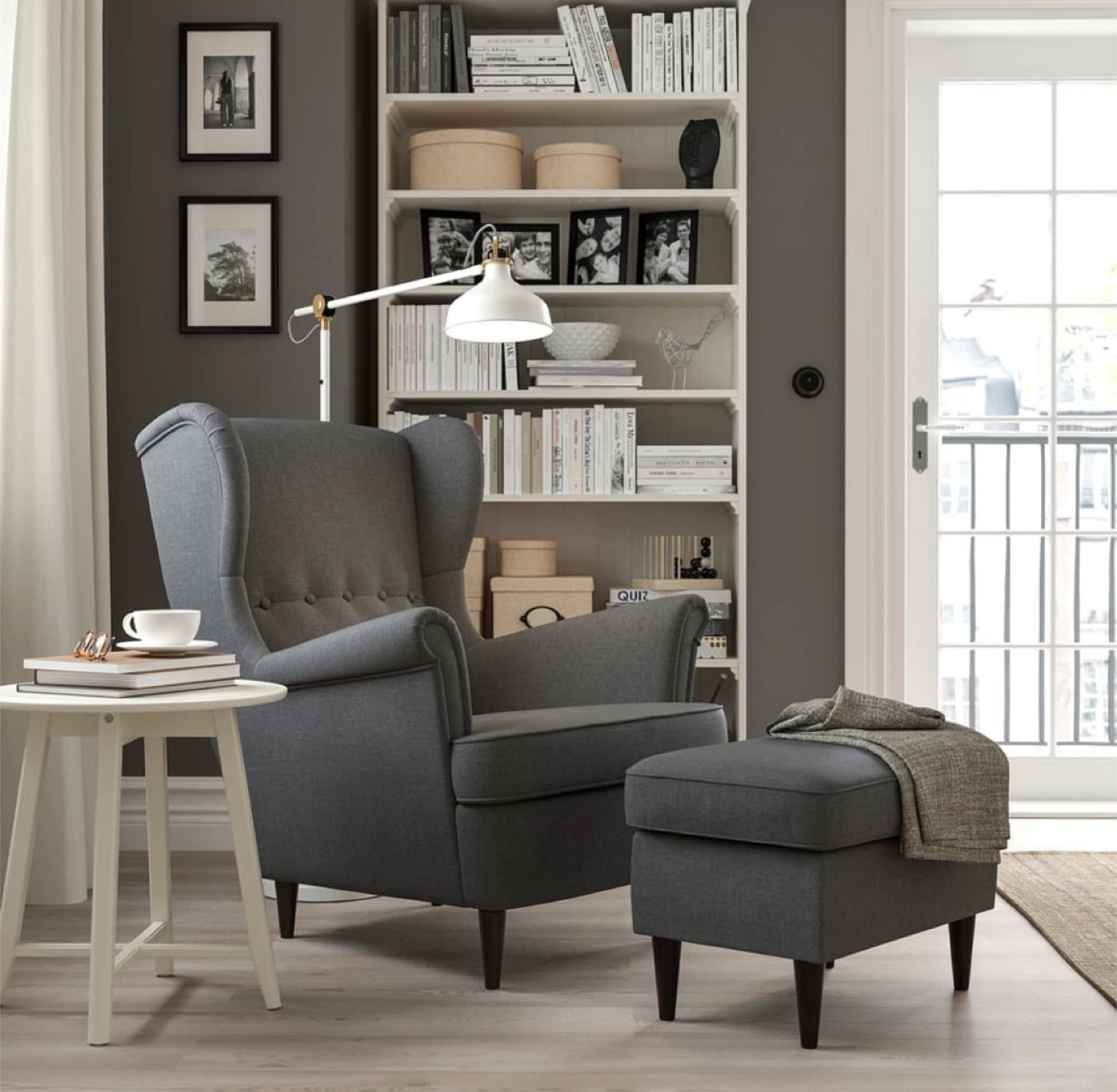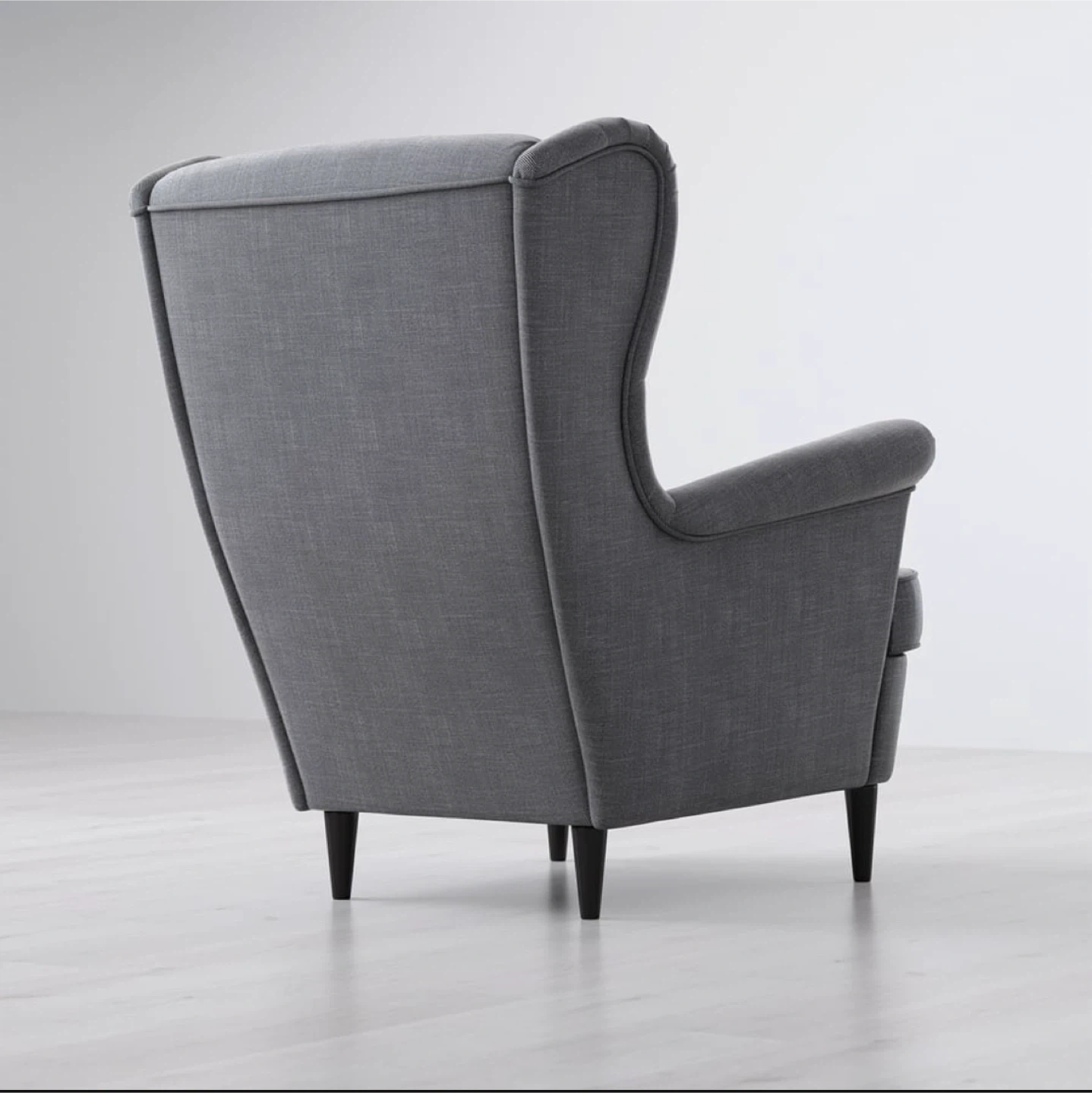 Two IKEA Strandmon wing chairs in gray fabric with two matching footstools.