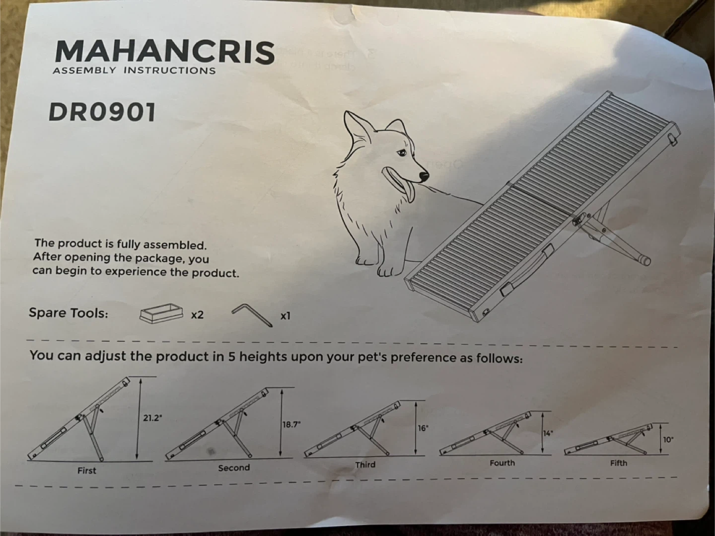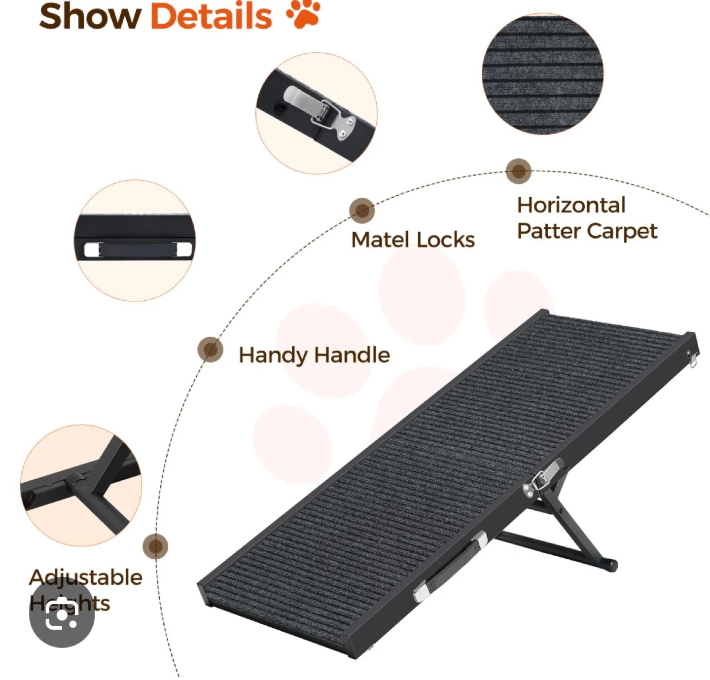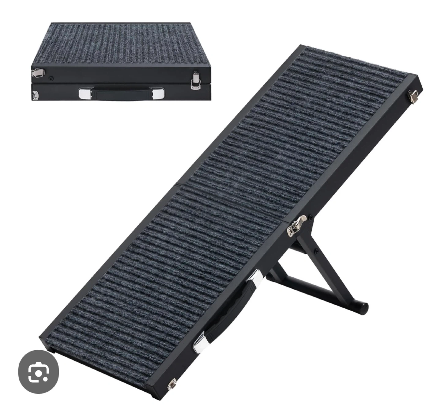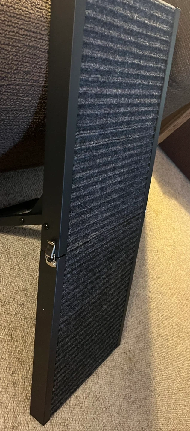 92Selling a Mahancris pet ramp in new condition! It features a horizontal patter carpet for good grip and adjustable heights to suit your pet's needs. It also has a handy handle for easy carrying and matel locks to keep it secure. The included assembly instructions are also included.