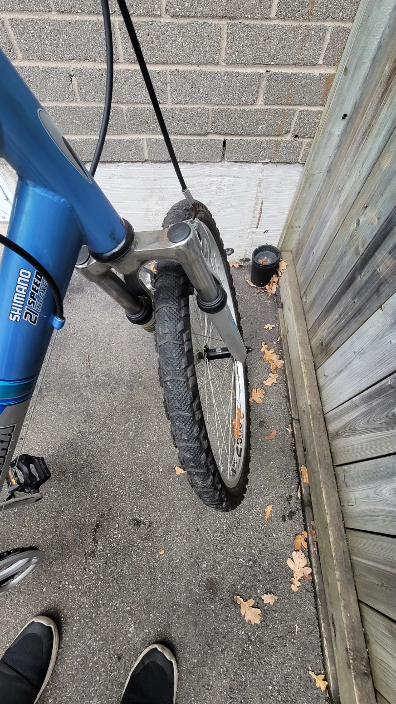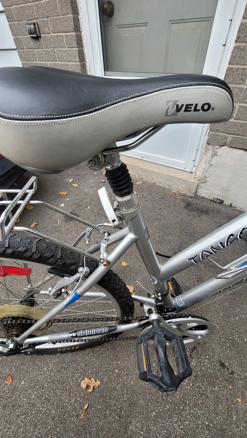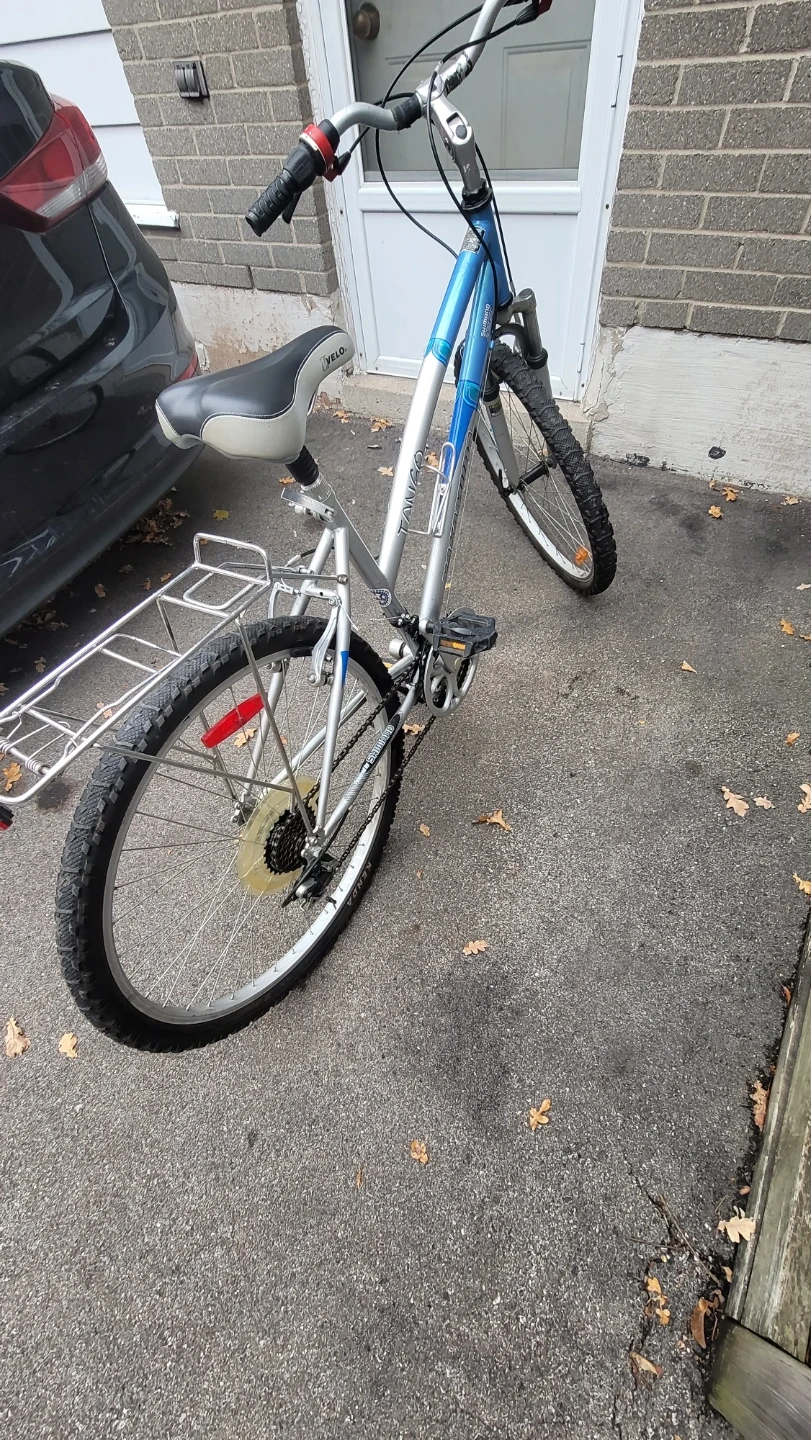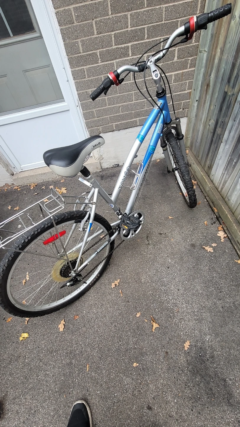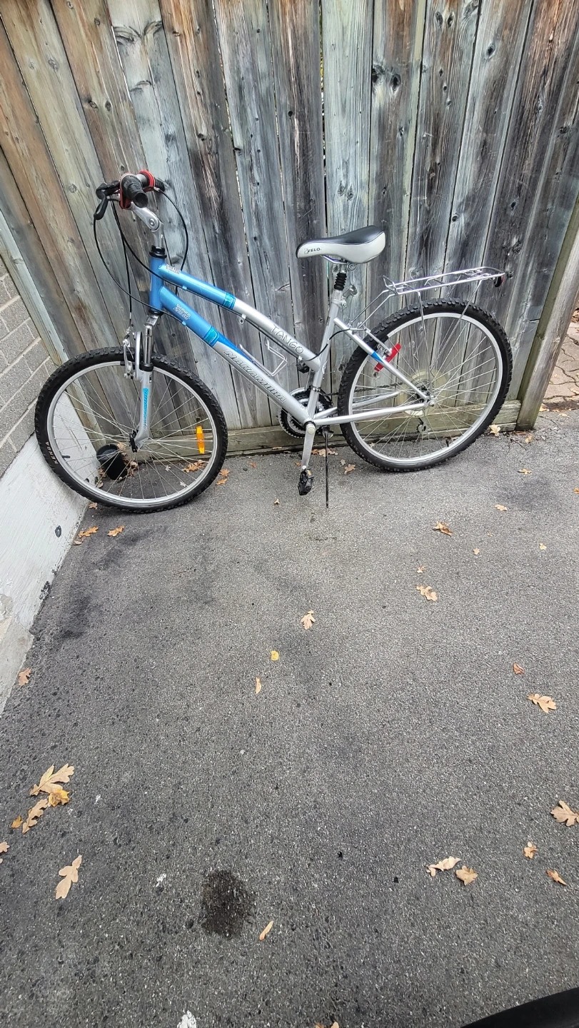 Selling a Nakamura mountain bike in silver and blue. It has a Velo seat and Shimano 21-speed gears. Great for trails or getting around town!