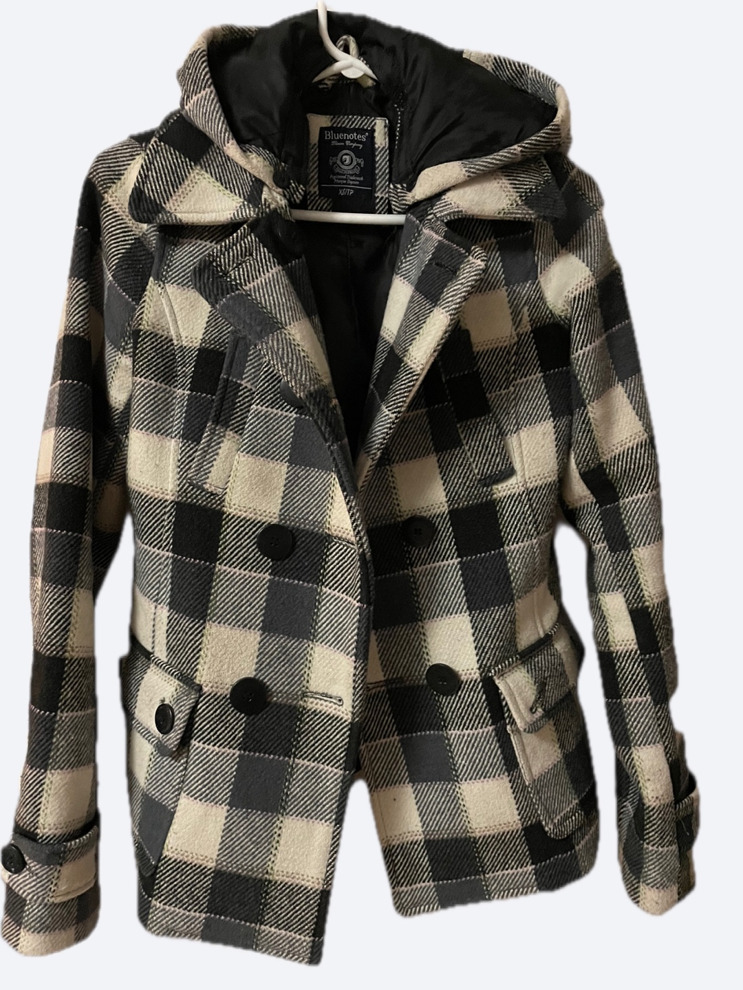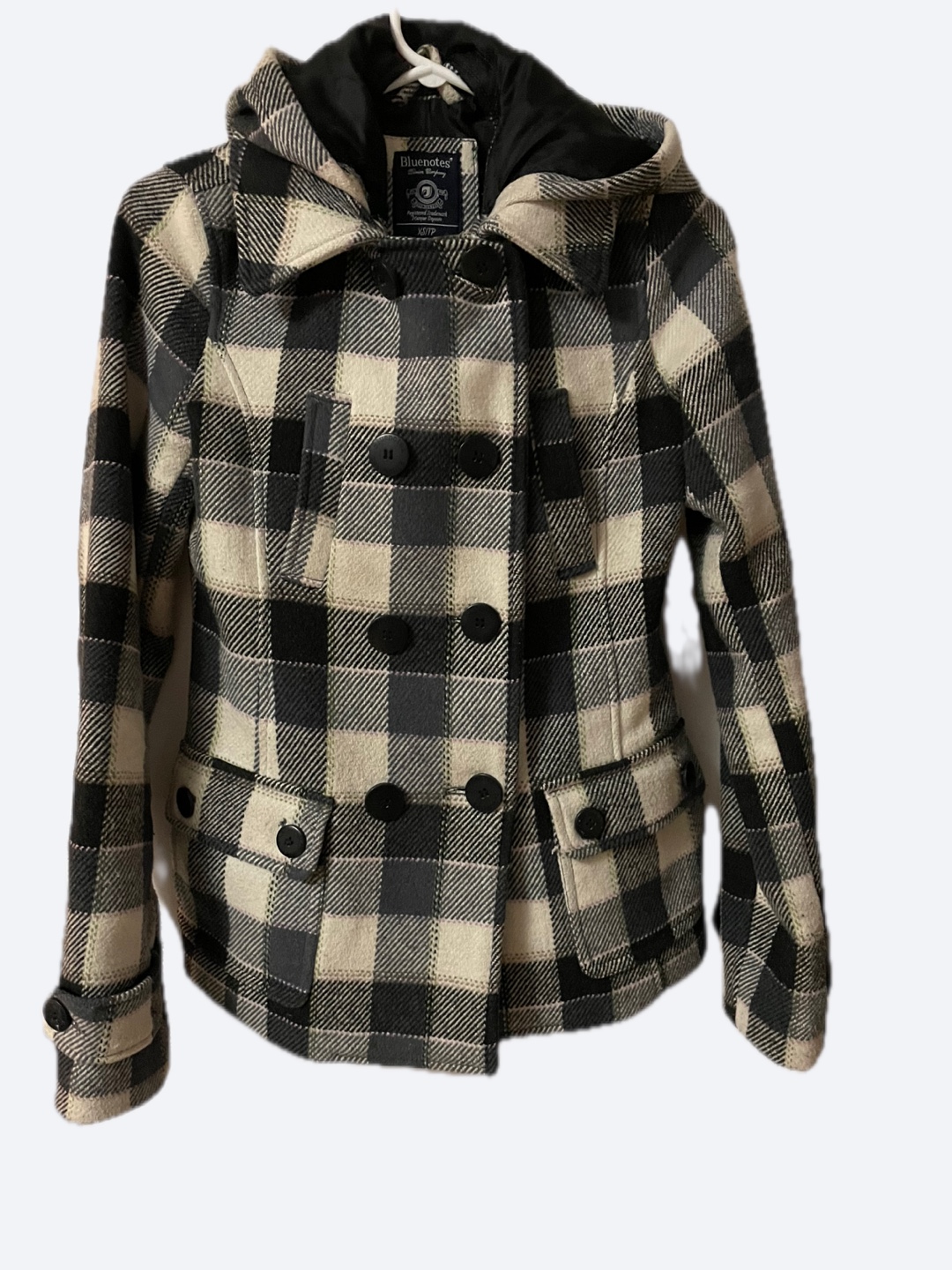 Cozy Bluenotes peacoat in a black and white plaid pattern. It's a size XS/TP and has removable hood, perfect for chilly weather!