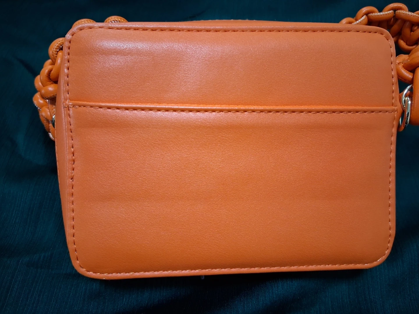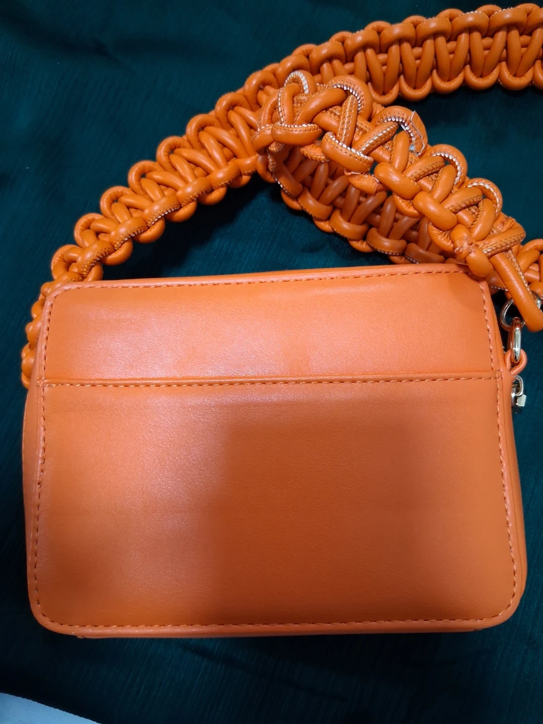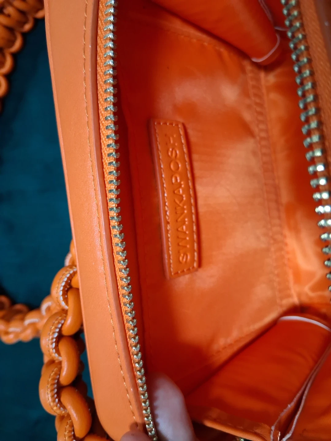 18Selling a SWANKAPOSH handbag in a vibrant orange color. It features a unique braided strap and a convenient zip closure. The interior has a few pockets to keep your essentials organized. It's a stylish and eye-catching accessory!