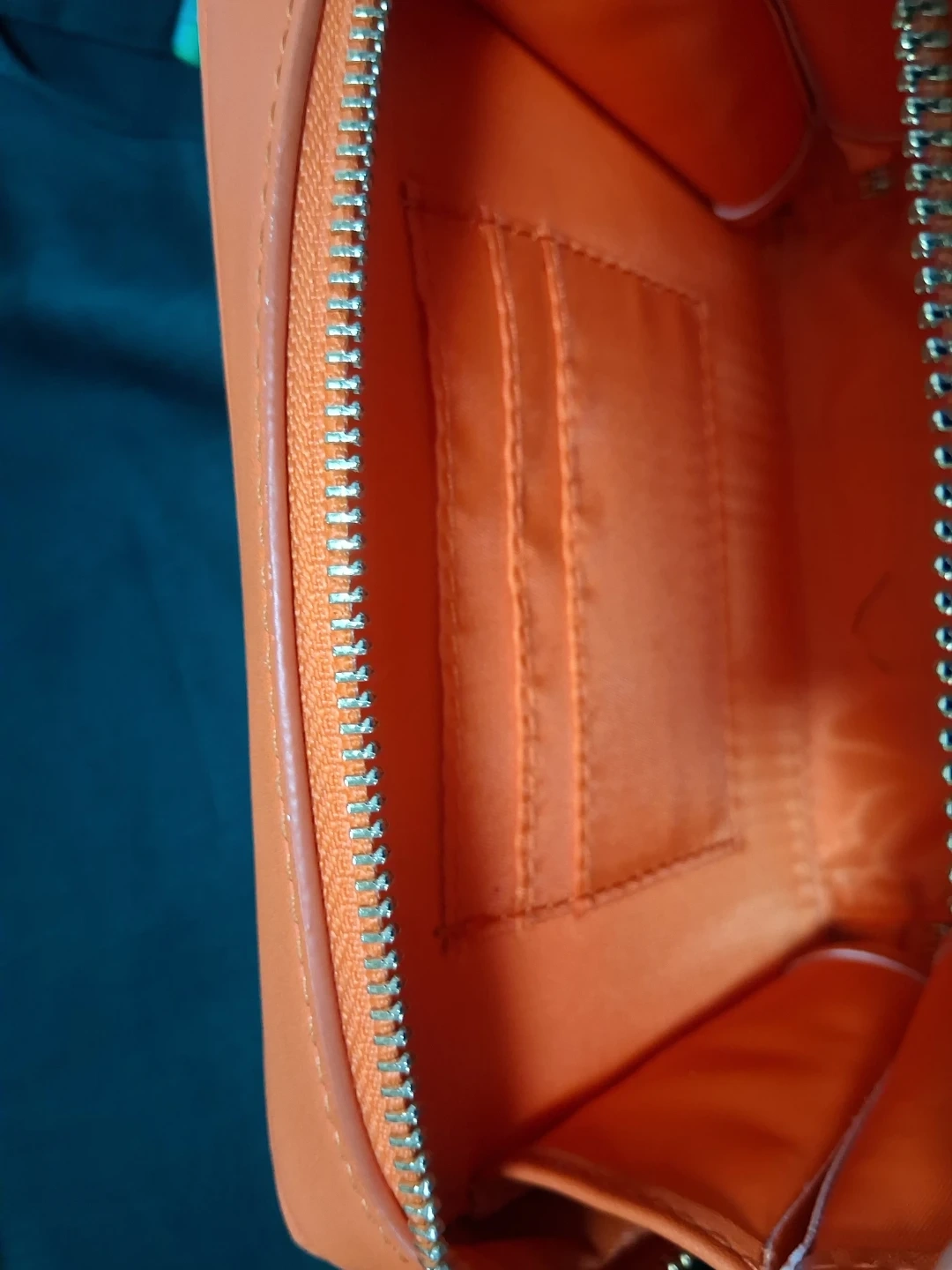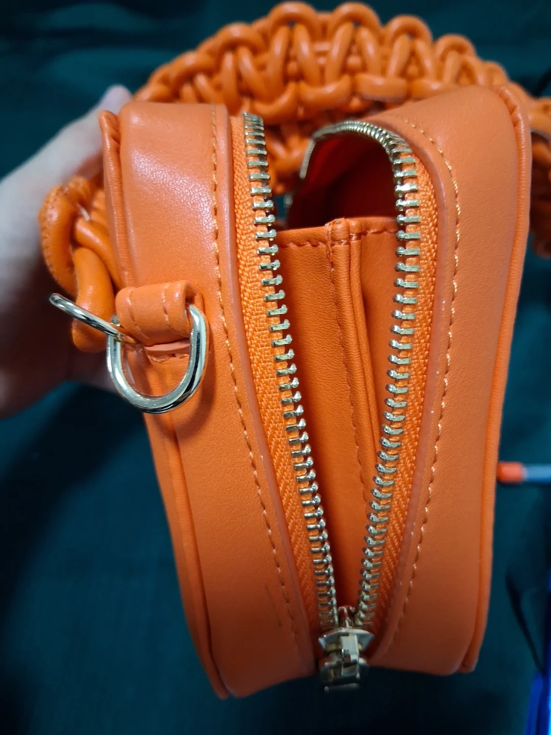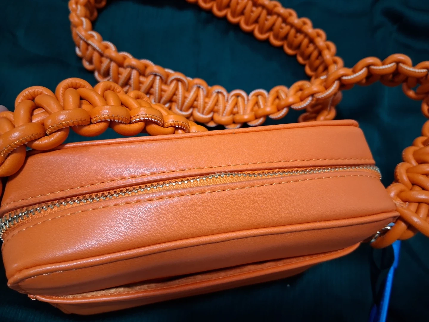 18Selling a SWANKAPOSH handbag in a vibrant orange color. It features a unique braided strap and a convenient zip closure. The interior has a few pockets to keep your essentials organized. It's a stylish and eye-catching accessory!