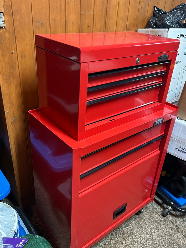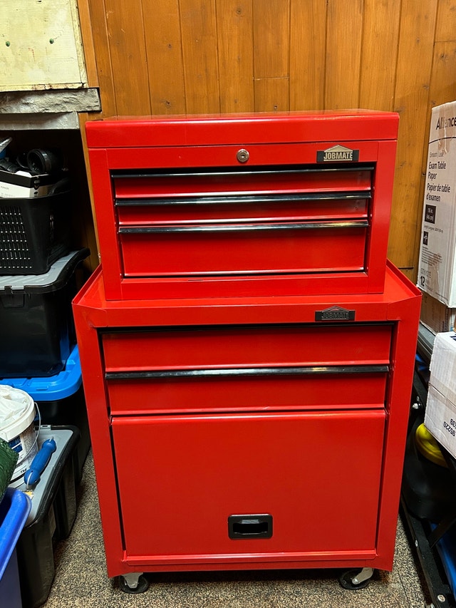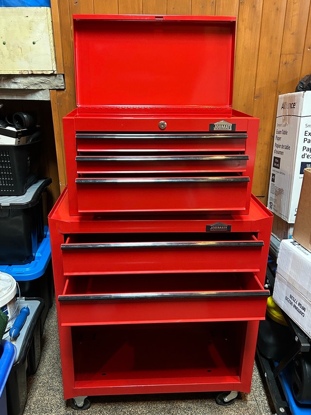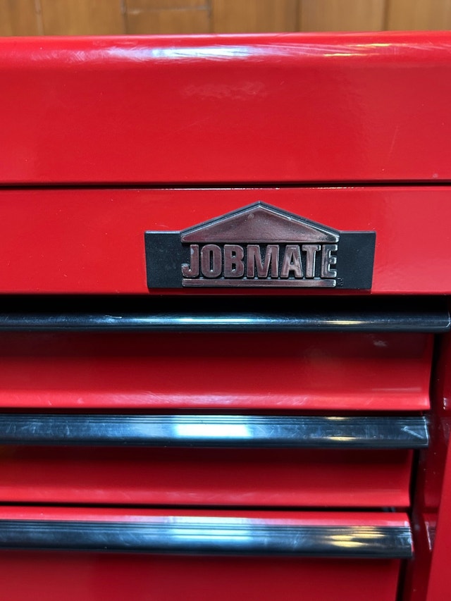Jobmate tool chest combo in excellent condition, perfect for organizing your tools. It has multiple drawers for ample storage. The unit is in good condition, ready for immediate use. Used only to store a couple of lights. - Brand: Jobmate - Colour: Red - Condition: excellent - Type: Tool Chest Combo Pick up in Bolton or Aurora