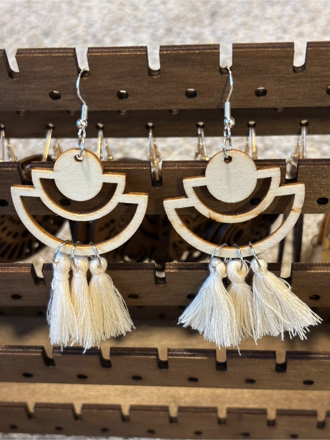 Selling a pair of handmade earrings! They feature a unique wooden design with white-coloured tassels. Perfect for adding a touch of boho-chic to any outfit.