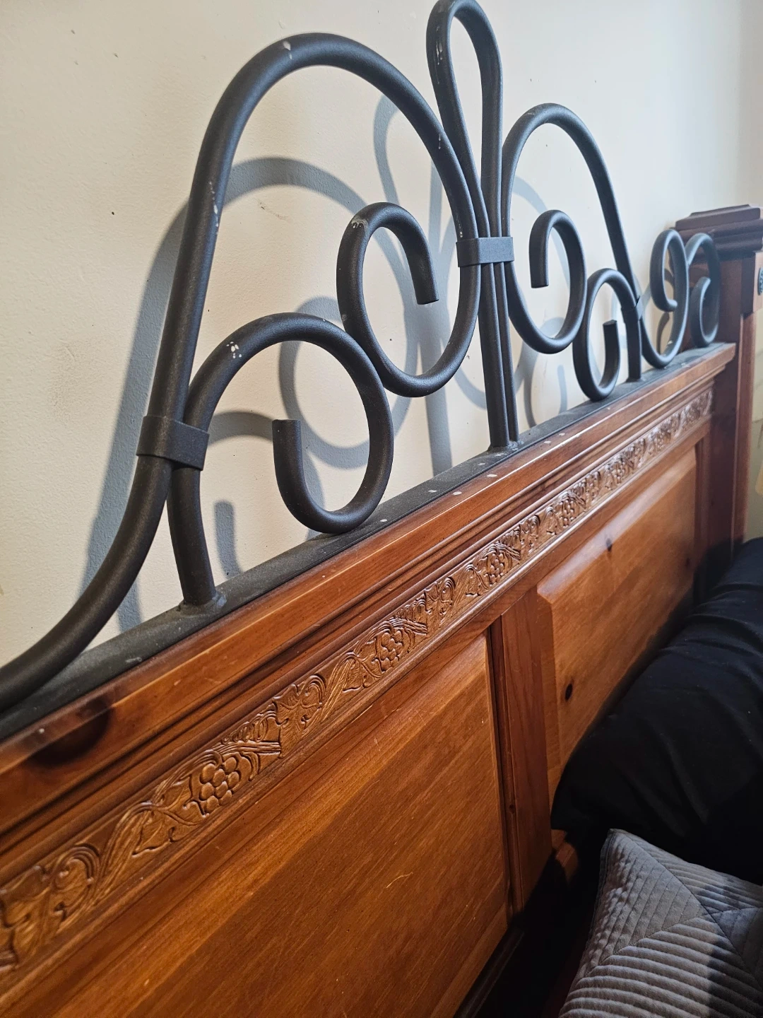Selling a Queen size bed frame, mattress, two 30" box springs (easy to get around tight corners), and sheets set. It features a wooden headboard with metal scrollwork detailing. Good condition and ready for a new home!