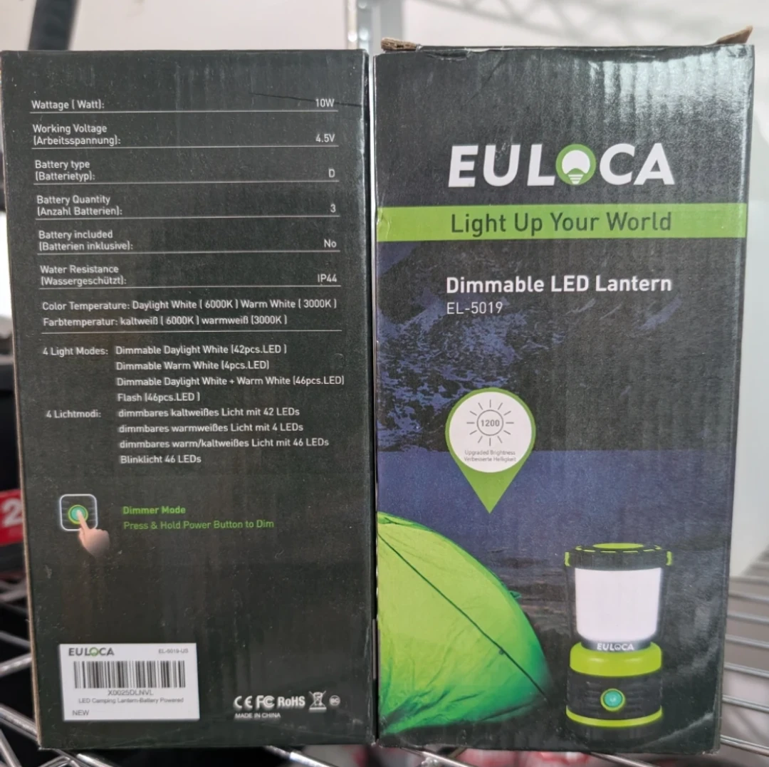 Selling 2 brand new Euloca dimmable LED lanterns, model EL-5019! It's battery-powered and has 4 light modes. The lantern is dimmable with a press and hold power button. It has a max lumen output of 1200 with 360 degree LED. The box is included!