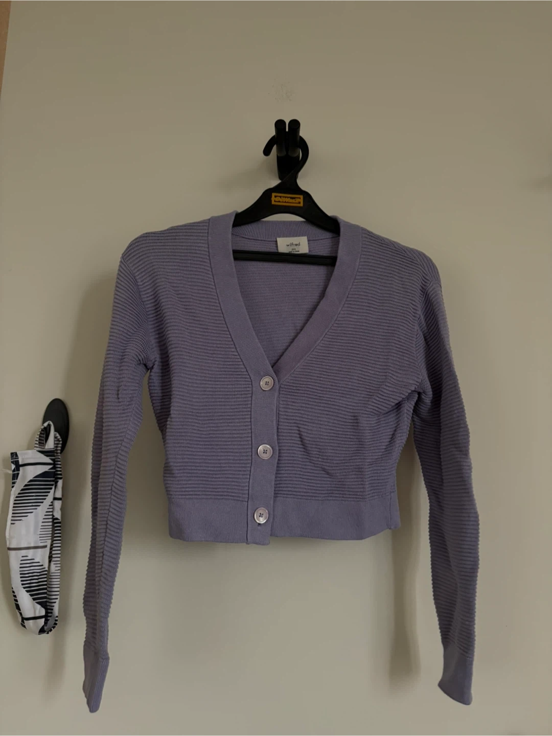 107This is a cute Wilfred cardigan in a lovely lavender colour. It's a size 2XS and in great condition! Perfect for layering or wearing on its own