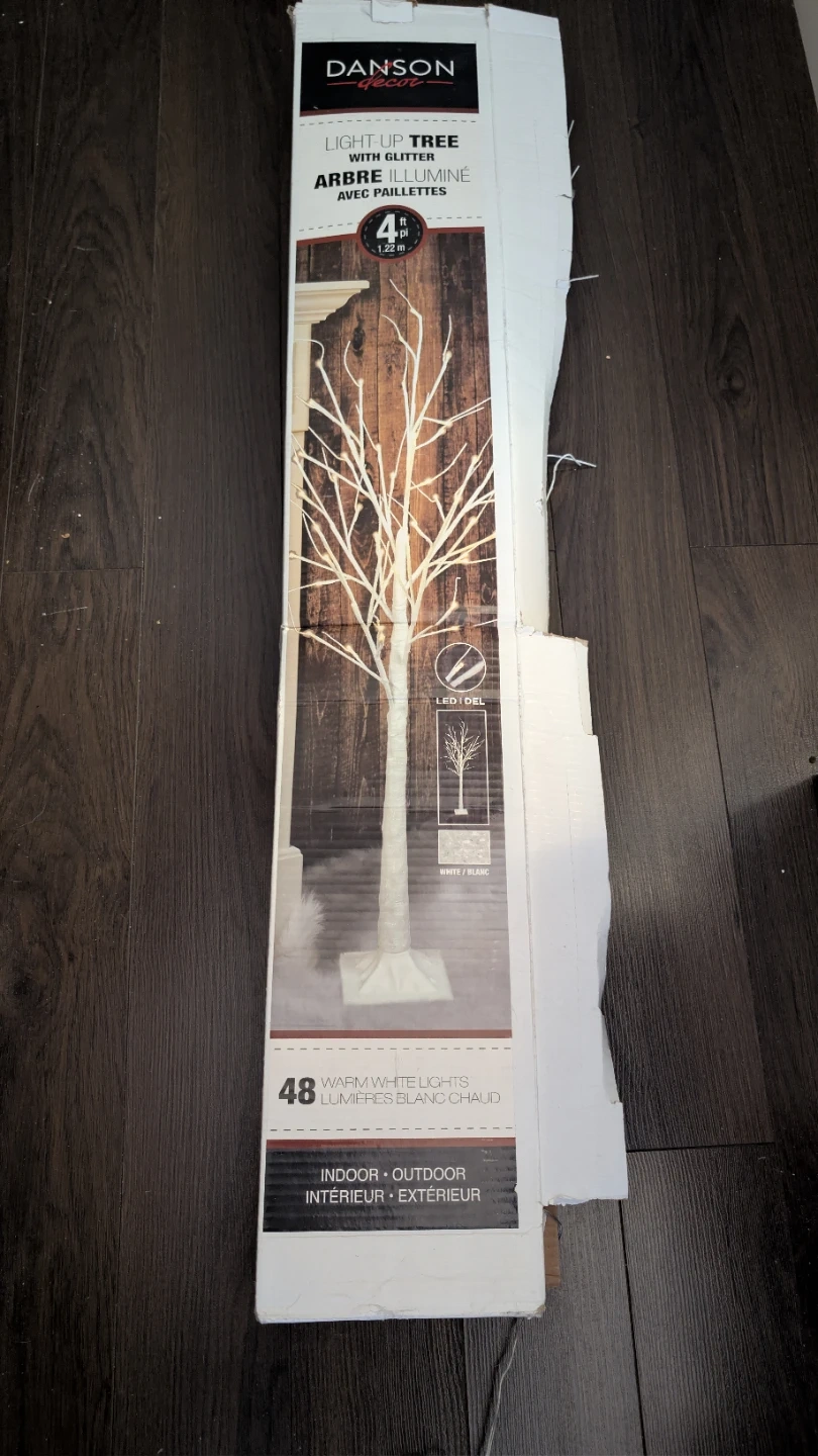 Selling a Danson Light Up Tree. It's 4 ft tall and has a glitter finish! It comes with 48 warm white lights and can be used indoors or outdoors. It comes in the original box