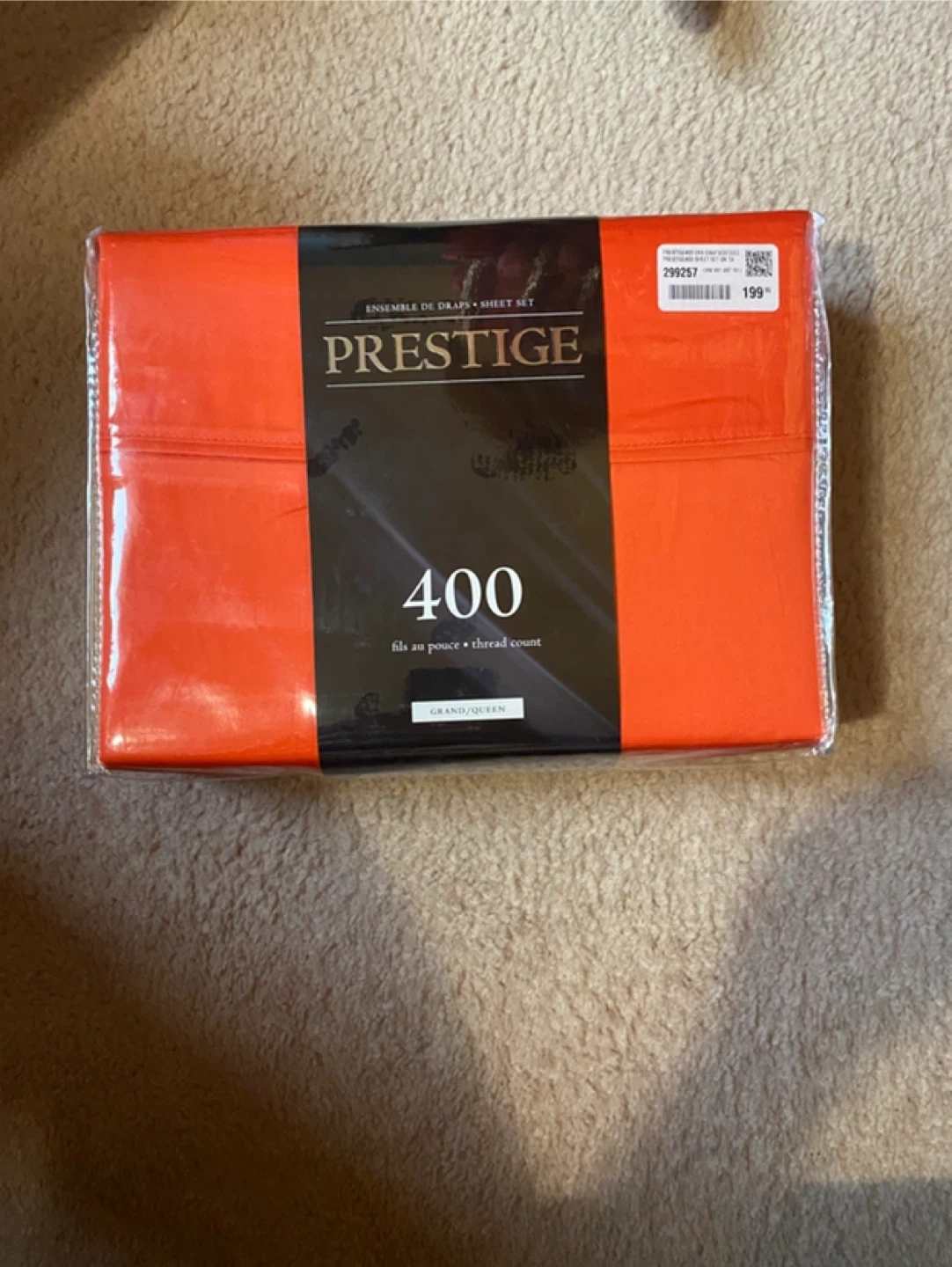Selling a brand new Prestige Grand Queen sheet set! It's 100% cotton and includes 1 deep flat sheet, 1 deep contour sheet, and 2 pillowcases with a 15” deep pocket. The thread count is 400. Machine washable