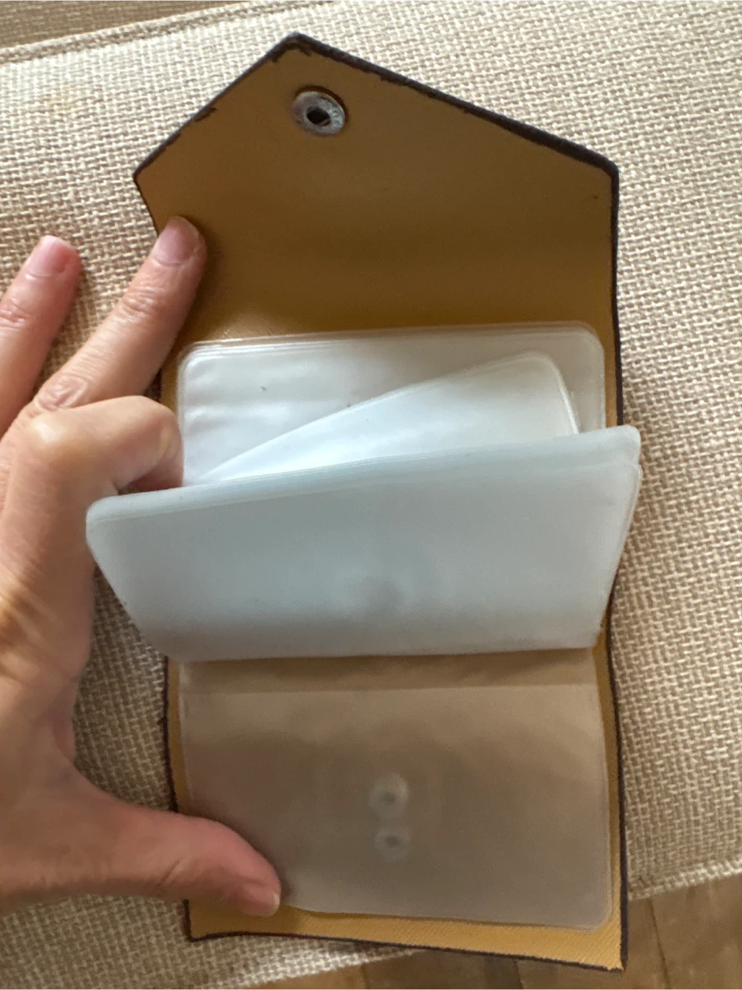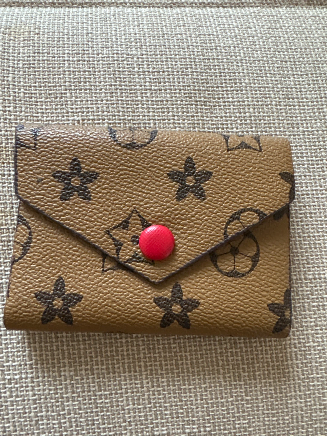Here's a cute card holder with a brown patterned design! It has a red button closure and clear plastic inserts inside to keep your cards organized