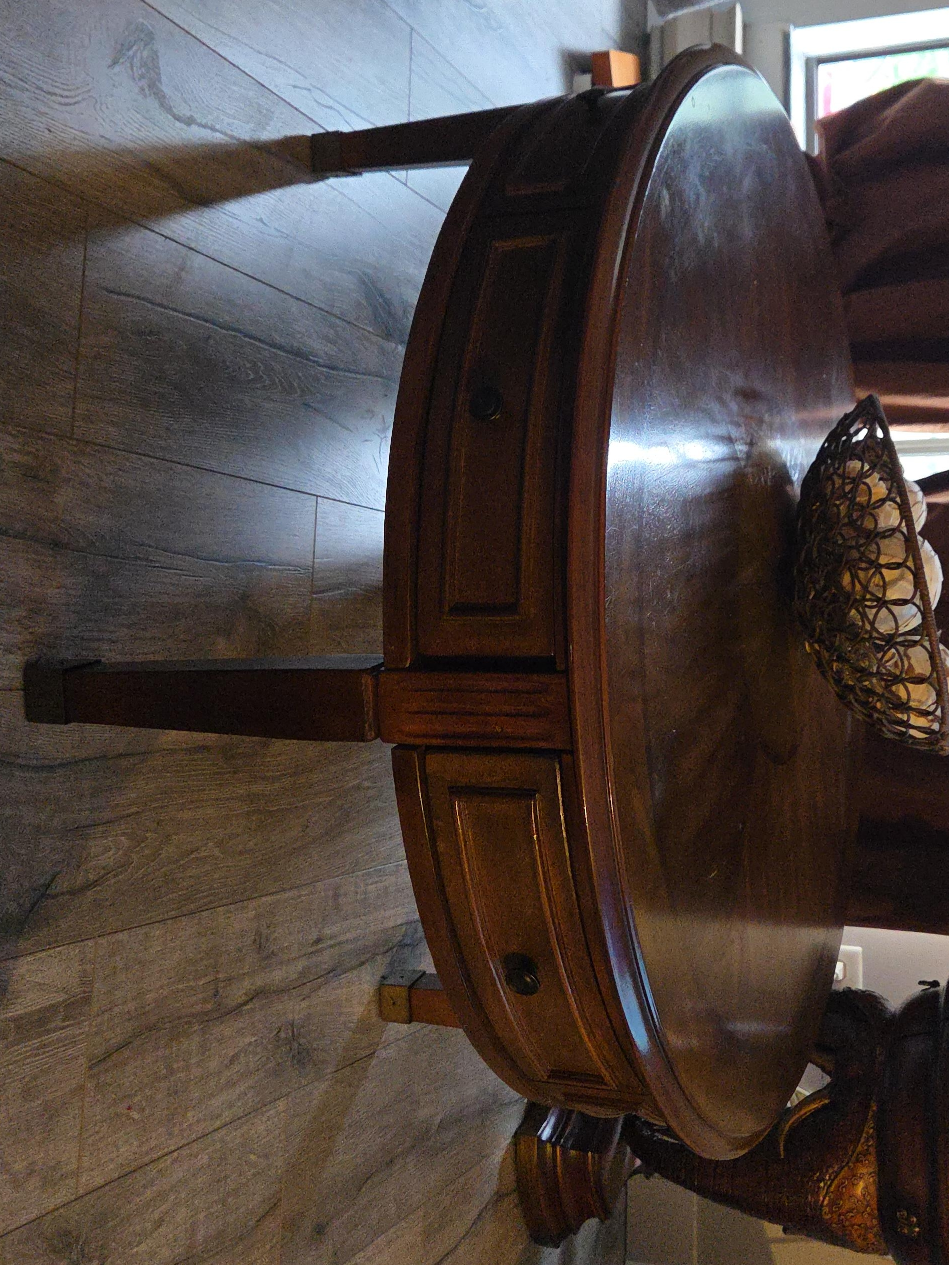 Here's a lovely round coffee table made of wood. It features handy drawers for storage. It's in great shape and would look fantastic in any living room!