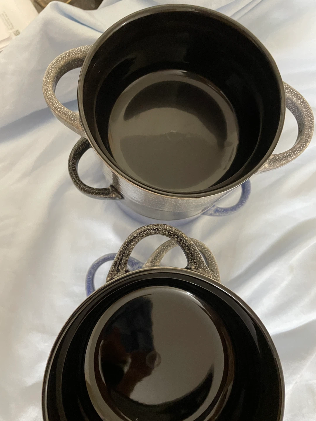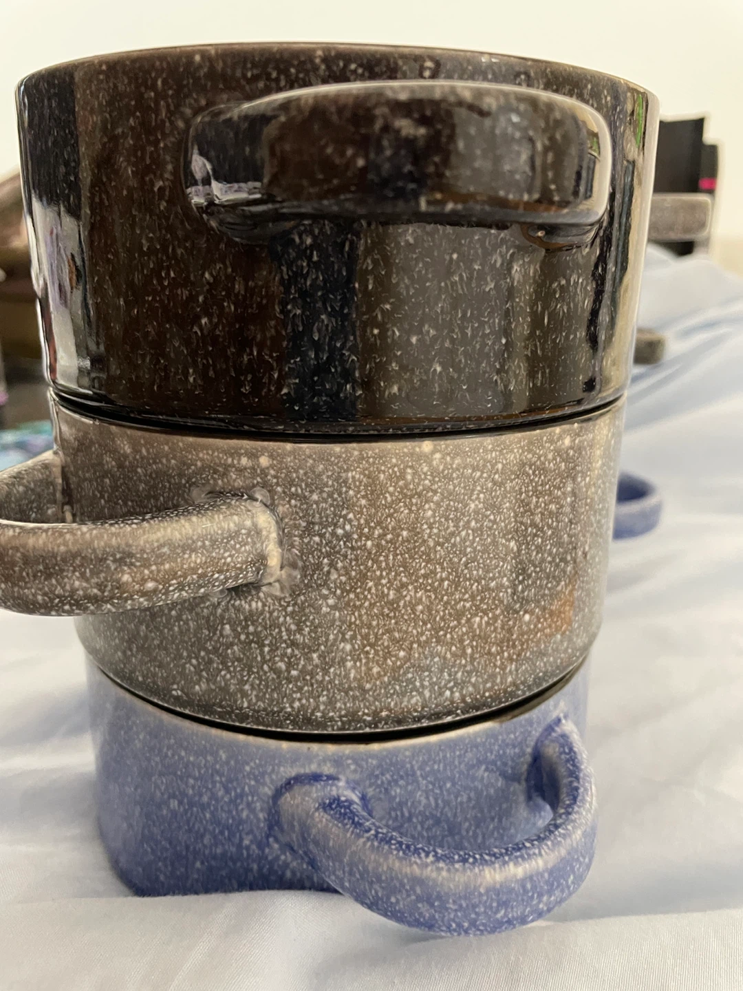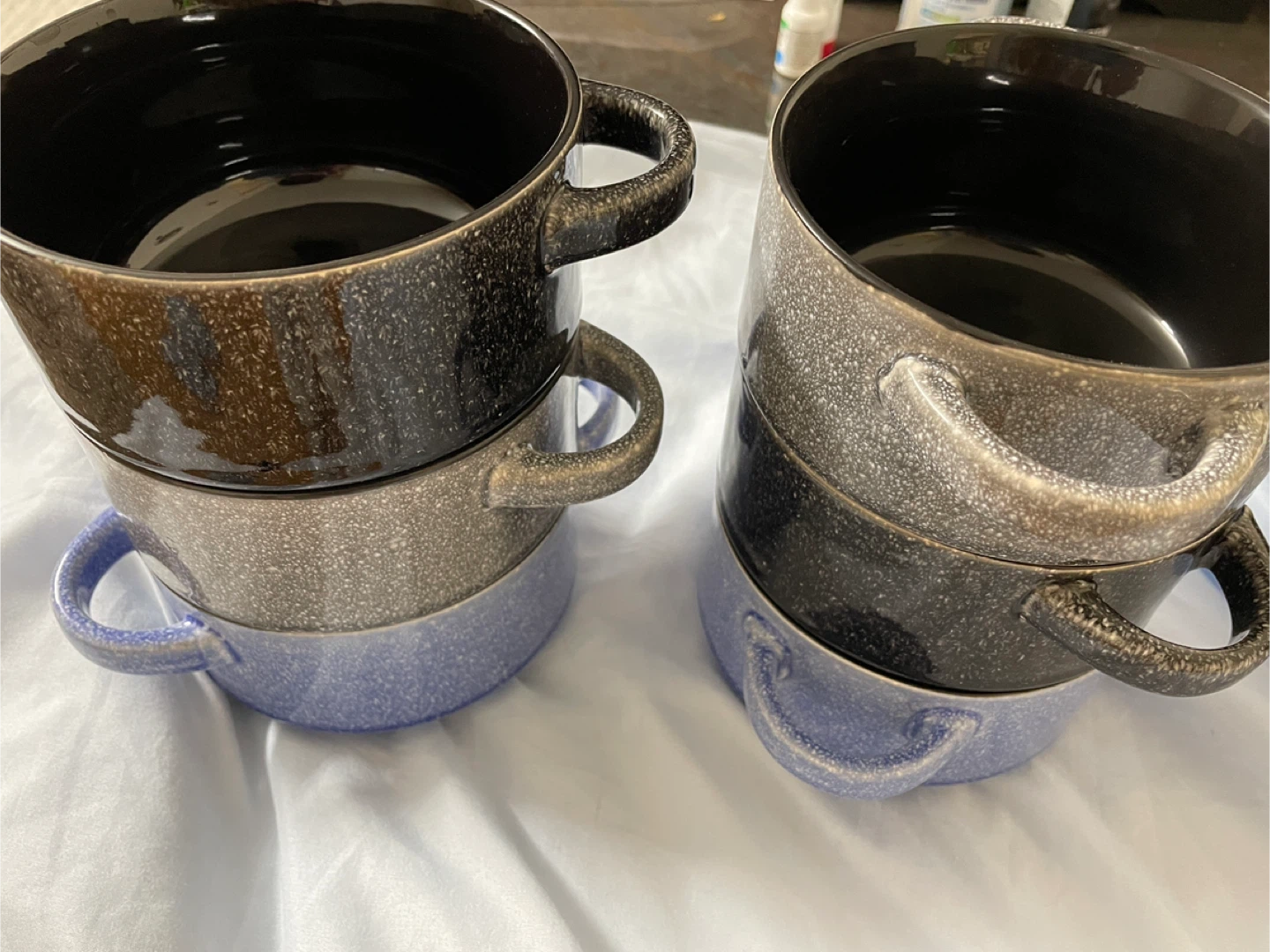Here's a set of four speckled soup bowls! They come in a mix of colours: black, grey, and blue. Perfect for cozy nights and hearty soups!