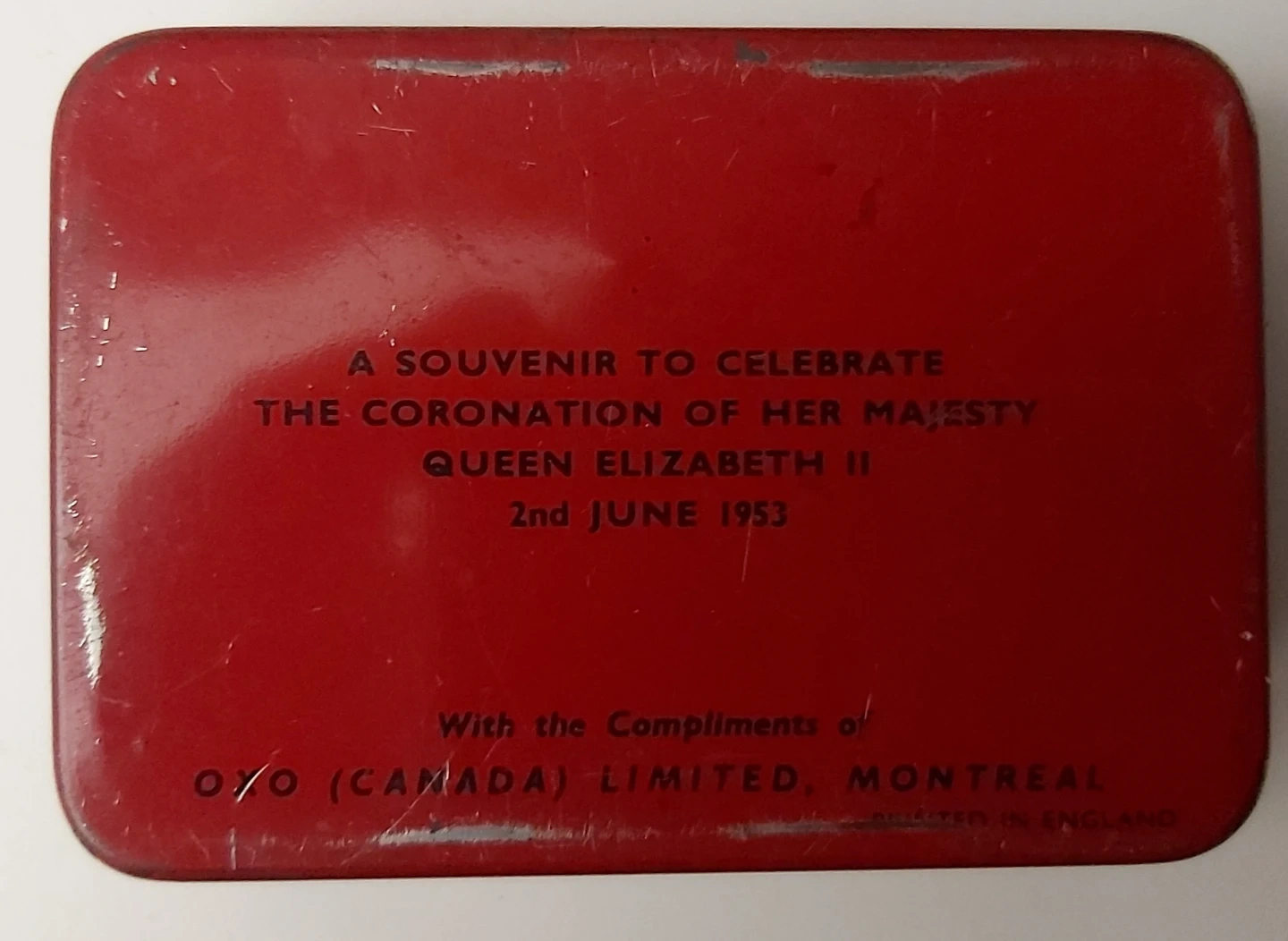 Selling a collectible tin featuring Queen Elizabeth II. It has a red background with the Union Jack and other royal symbols. Perfect for collectors or anyone interested in royal memorabilia! 3.75" x 2.5". Cash only.