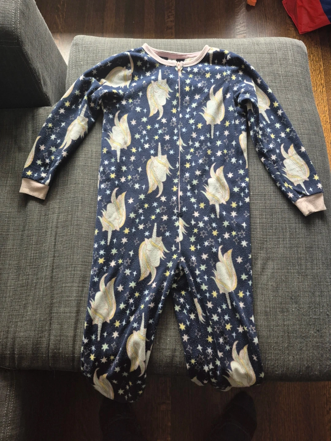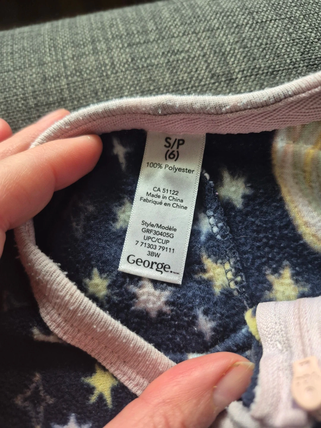 Cozy up in this adorable George fleece onesie! It features a fun unicorn and star pattern on a navy blue background. Made from 100% polyester, it's super soft and perfect for lounging. The size is S (6).