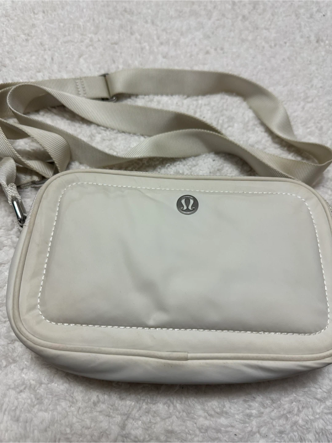 Stylish Lululemon crossbody camera bag in light ivory. Perfect for everyday use. Adjustable strap, front and back drop-in pockets, two zippered compartments