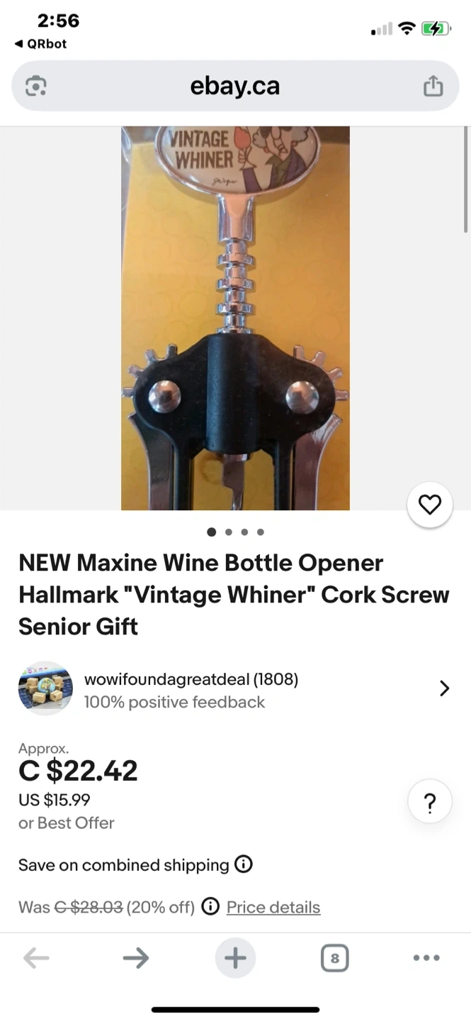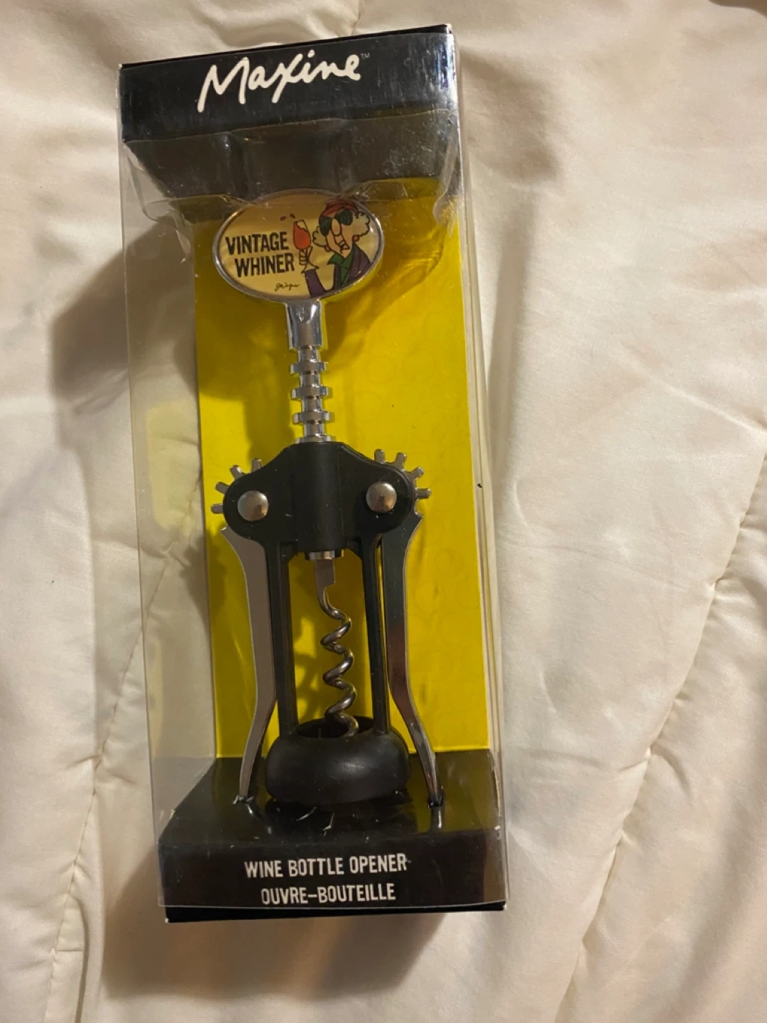 106I have a brand new Maxine wine bottle opener for sale! It's still in its original packaging and features the "Vintage Whiner" design. Perfect for a fun addition to your home bar or as a gift!