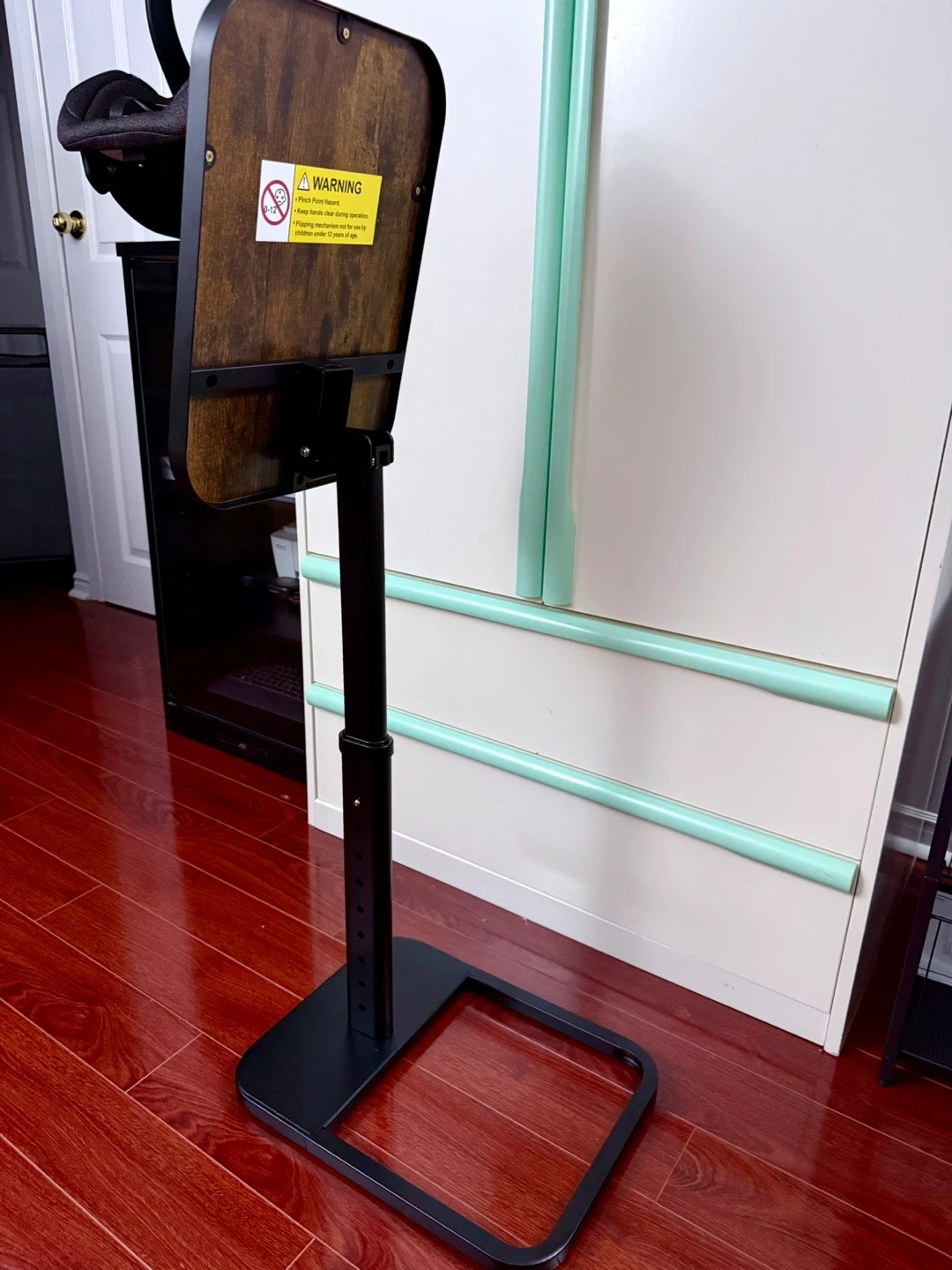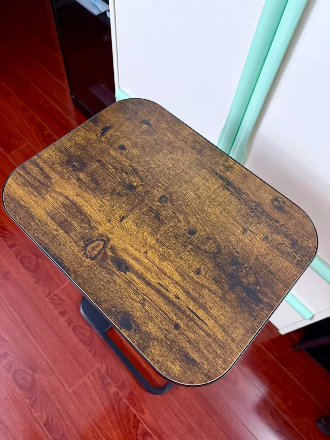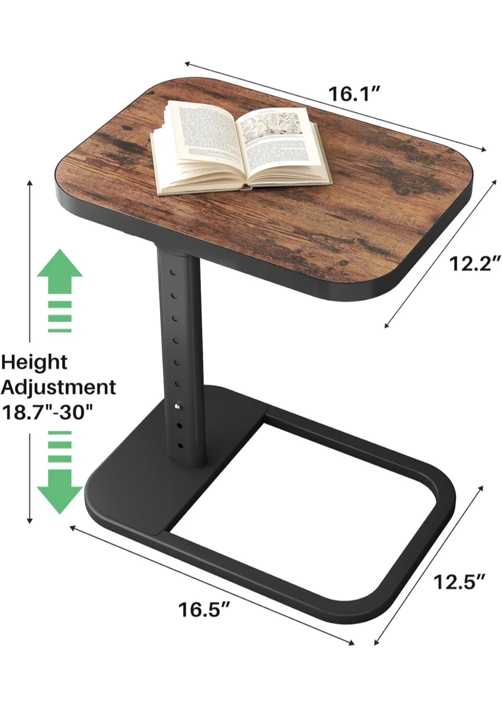 This side table has a wood-look top and a black metal base. It's adjustable in height from 18.7" to 30". The tabletop measures 16.1" by 12.2". Use it for your laptop or as a convenient surface next to your couch!