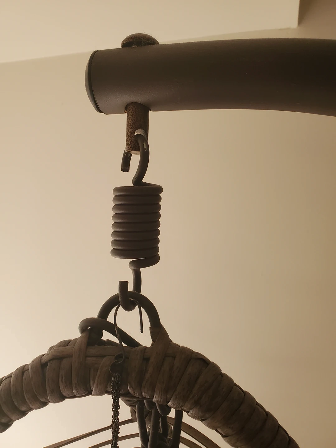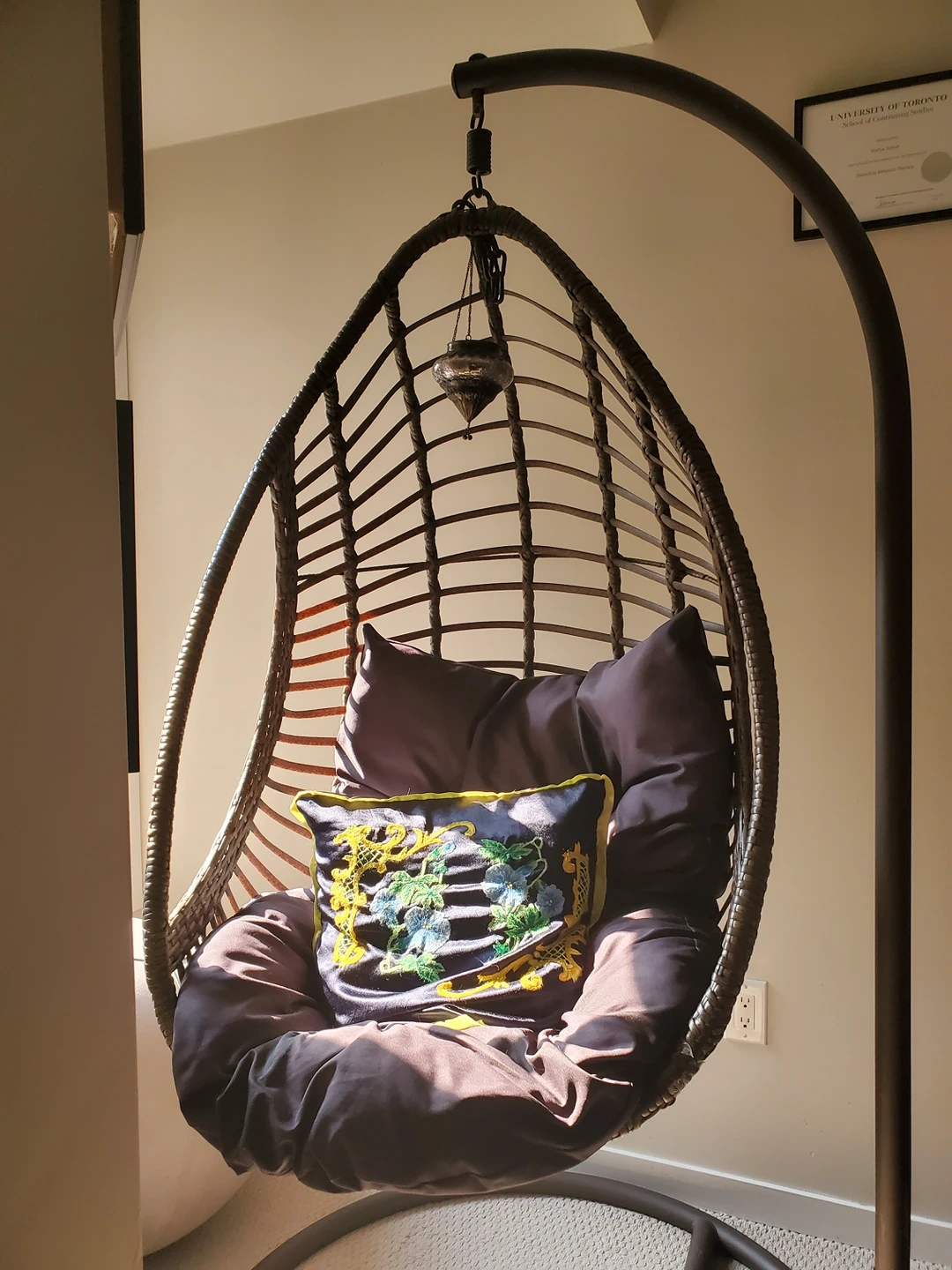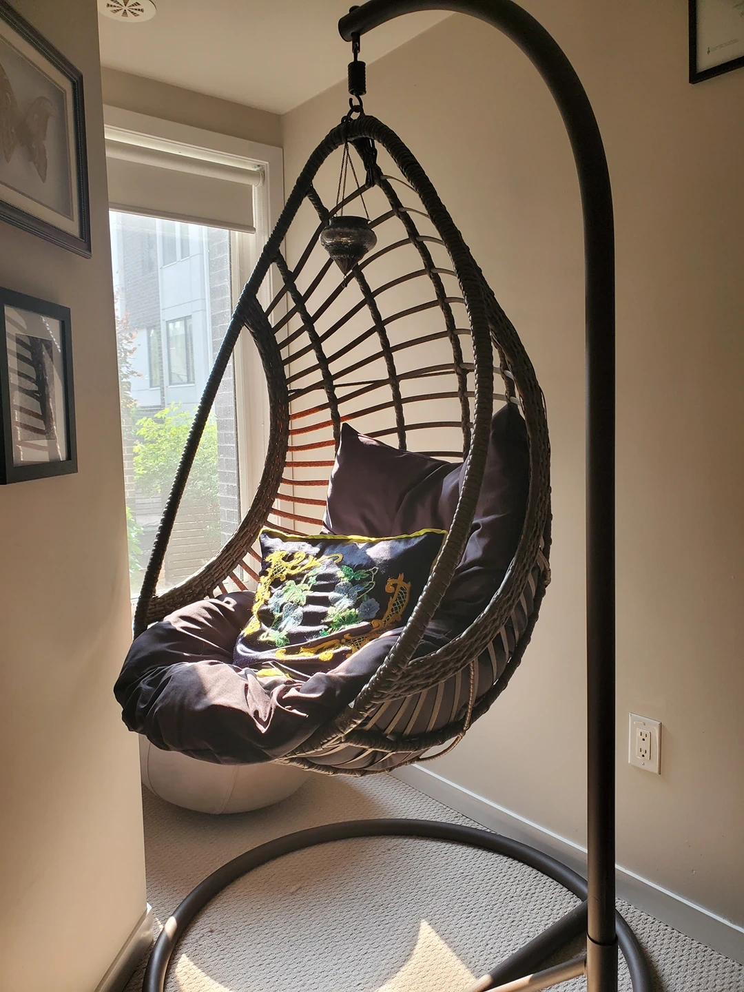 Selling my favourite hanging egg chair as we no longer live in a home that allows for this lovely chair to be placed outdoors due to limited balcony space. Cushion is water resistant. Hanging egg chair waterproof cover available for extra $50. Holds up to 300lbs. Additional chain allows for lowering the chair closer to the ground. Can be placed indoors or outdoors though is intended for outdoor use.