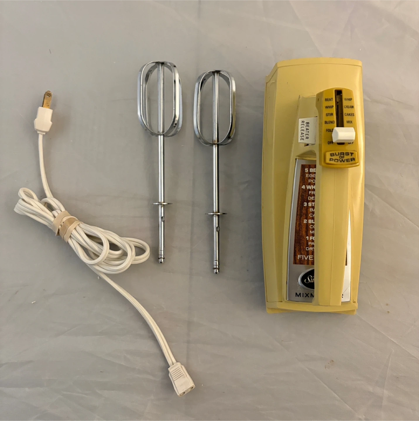 Selling a vintage Sunbeam Mixmaster hand mixer. It has five speeds and a burst of power button. Great for beating eggs, whipping cream, stirring cake batter, blending cookies, and folding pastries. Comes with the beaters and power cord.