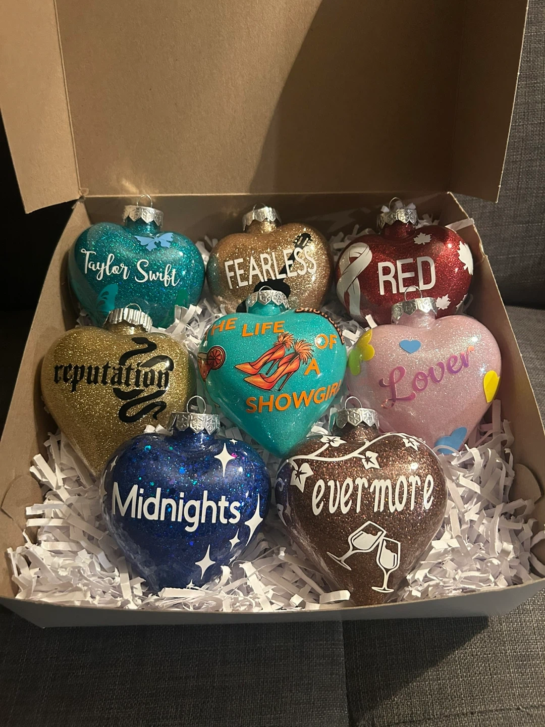 Selling a set of handmade heart ornaments inspired by Taylor Swift albums! They come in a variety of colours and styles, each representing a different album. Perfect for any Swiftie's holiday decor!
