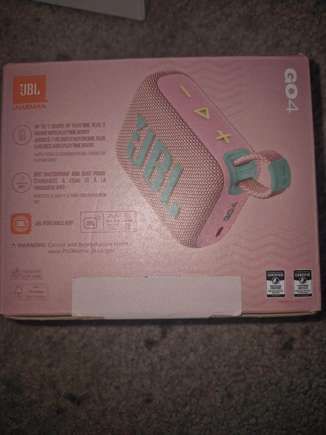Selling a JBL Go 4 portable Bluetooth speaker in pink! It's brand new and still in the box. Enjoy up to 7 hours of playtime, and it's IP67 waterproof and dustproof. Perfect for on-the-go tunes!