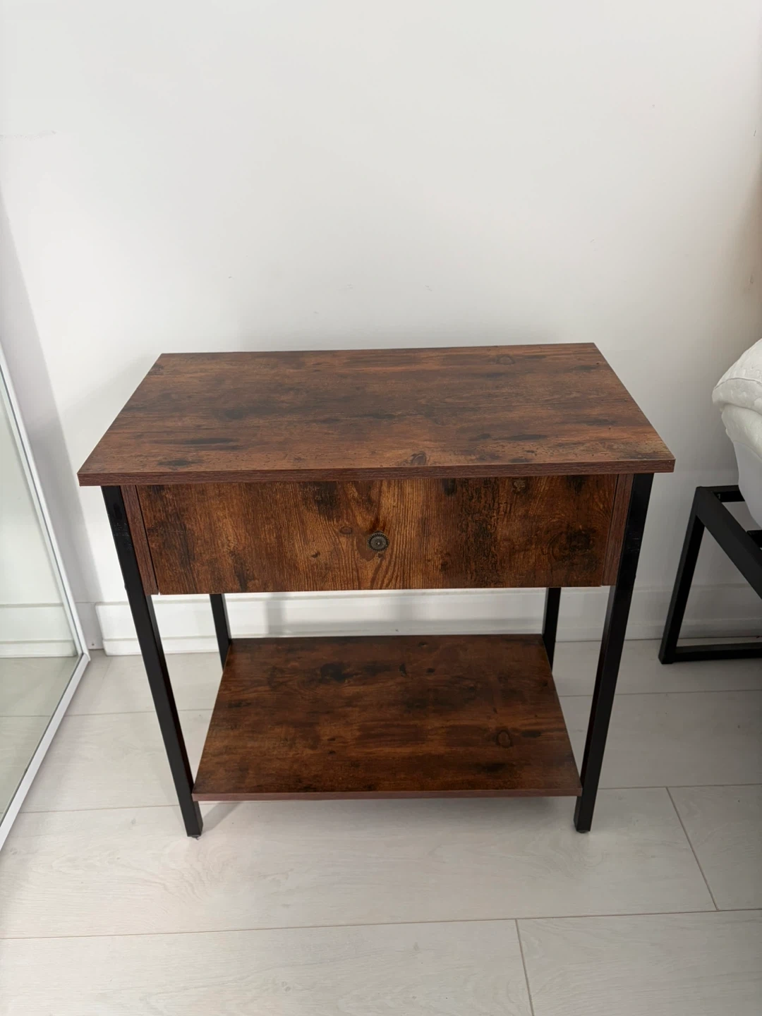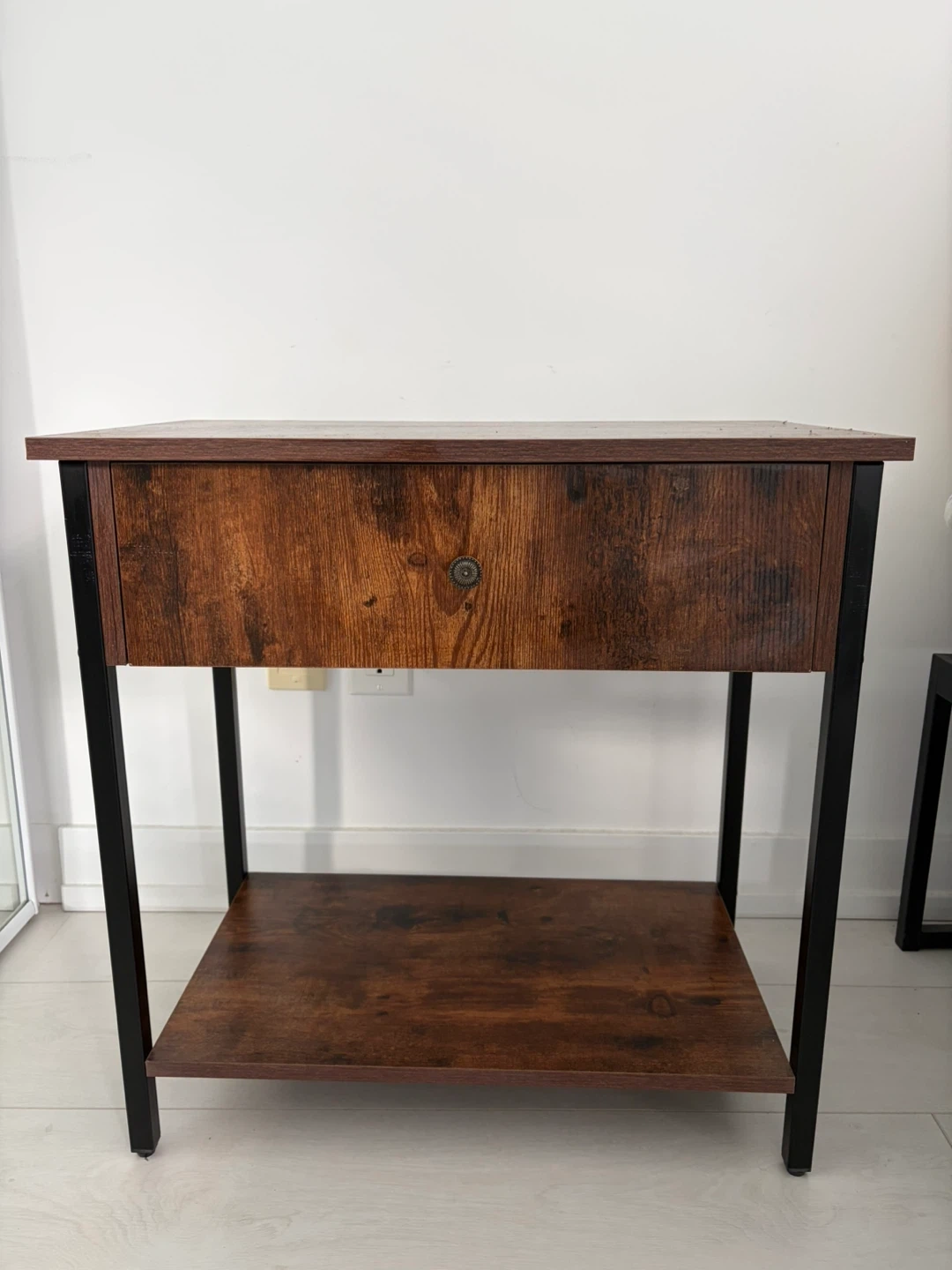 Looking to sell 2 lovely brown wood nightstands! It features a drawer and an open shelf for extra storage. The frame is black metal. It's in great condition and would look great in any bedroom or living space