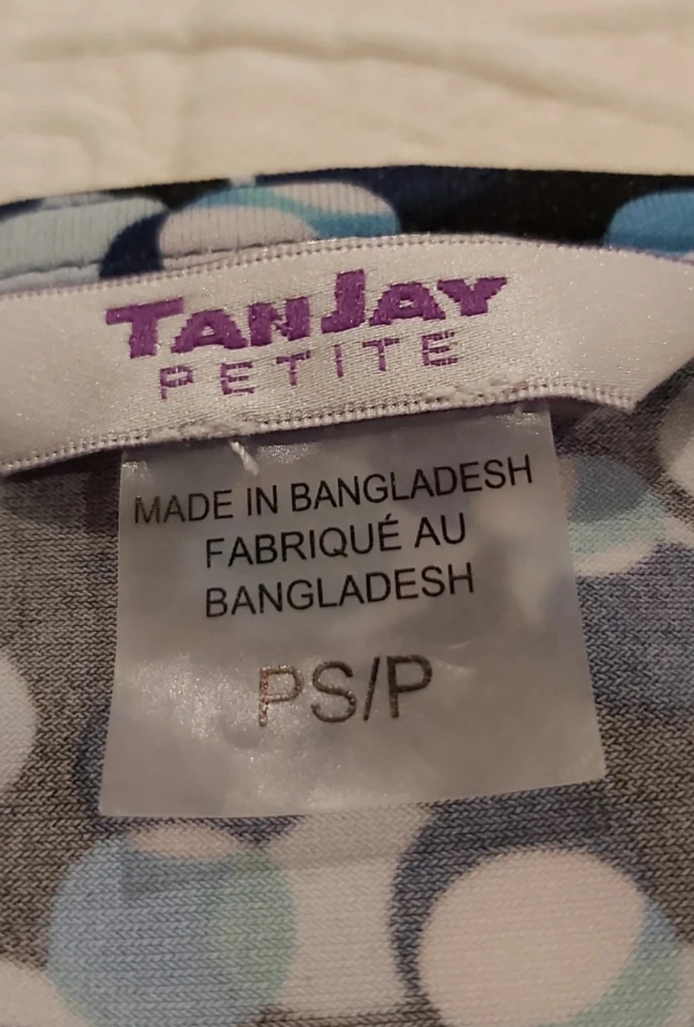 Here's a lovely Tanjay Petite blouse with a fun polka dot pattern! It's a size PS/P and made from 95% polyester and 5% elastane. Easy to care for, just machine wash cold and tumble dry on low. Front lined. You can try it on for size. Cash only.