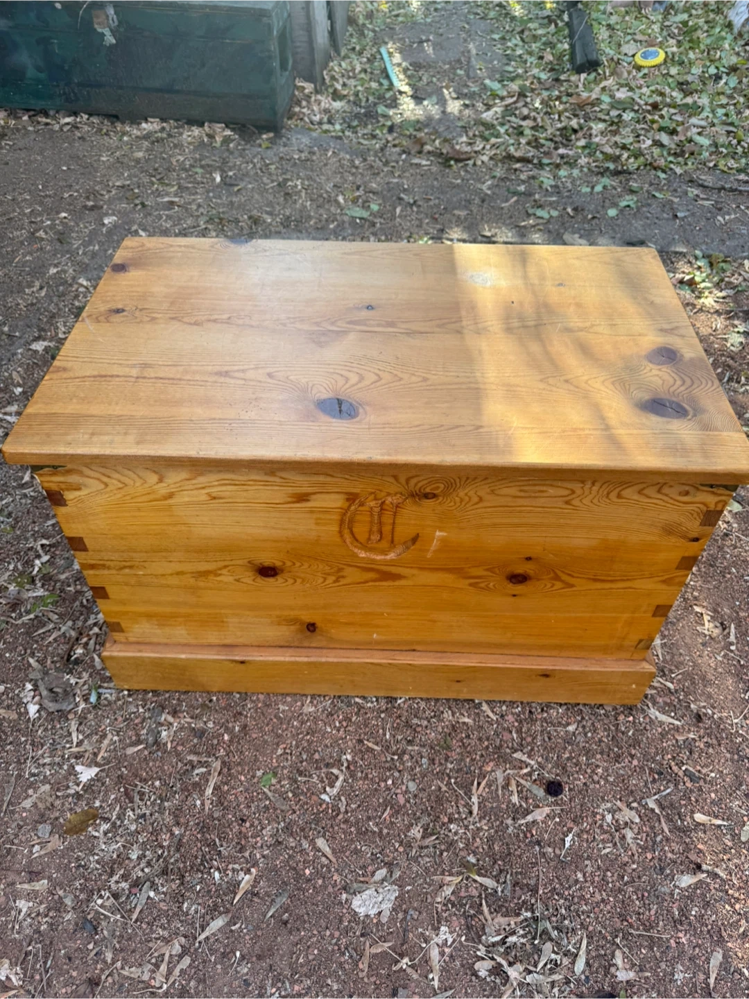 Selling a wooden storage trunk. It's a great piece for adding some rustic charm and extra storage to any room. The trunk is made of wood and features a unique design on the front. It's perfect for storing blankets, linens, or any other items you want to keep out of sight