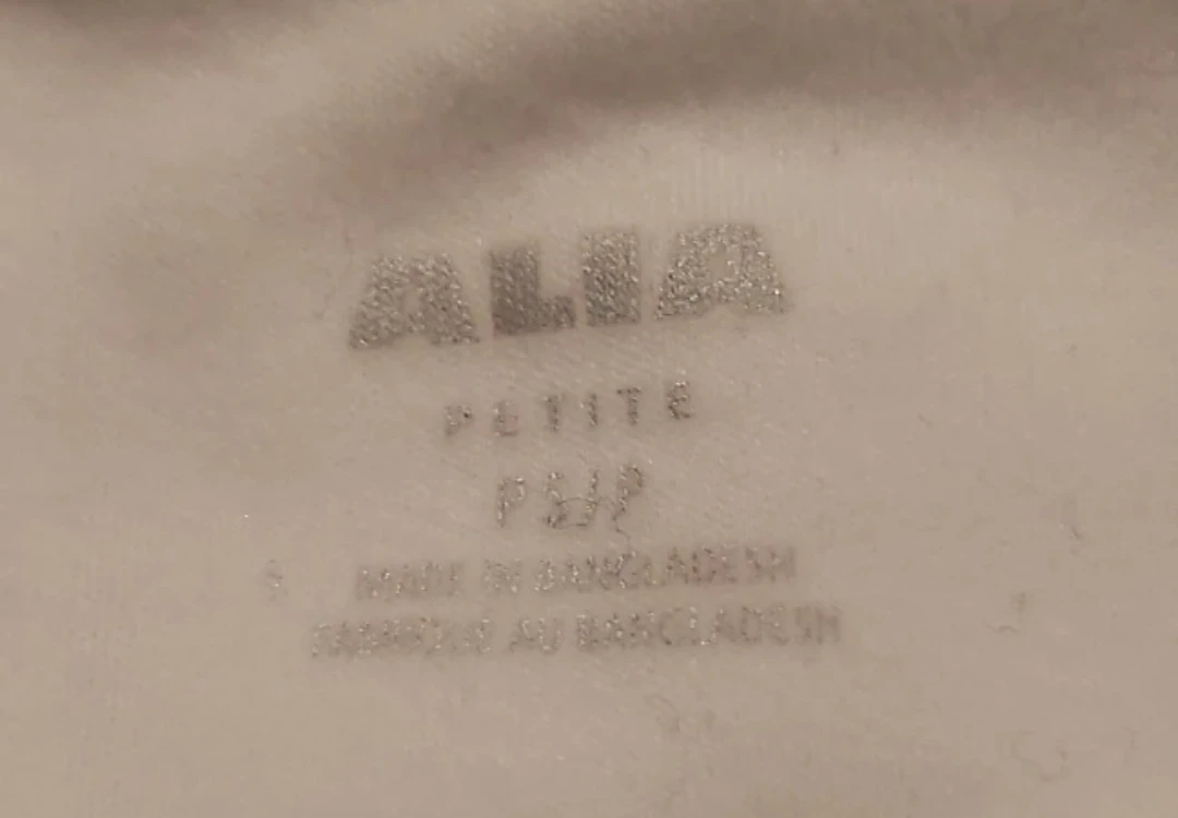 Here's a cute Alia Petite white t-shirt! It's size S/P and made of 60% cotton and 40% polyester. The shirt features a lovely blue floral design on the front. Cash only.
