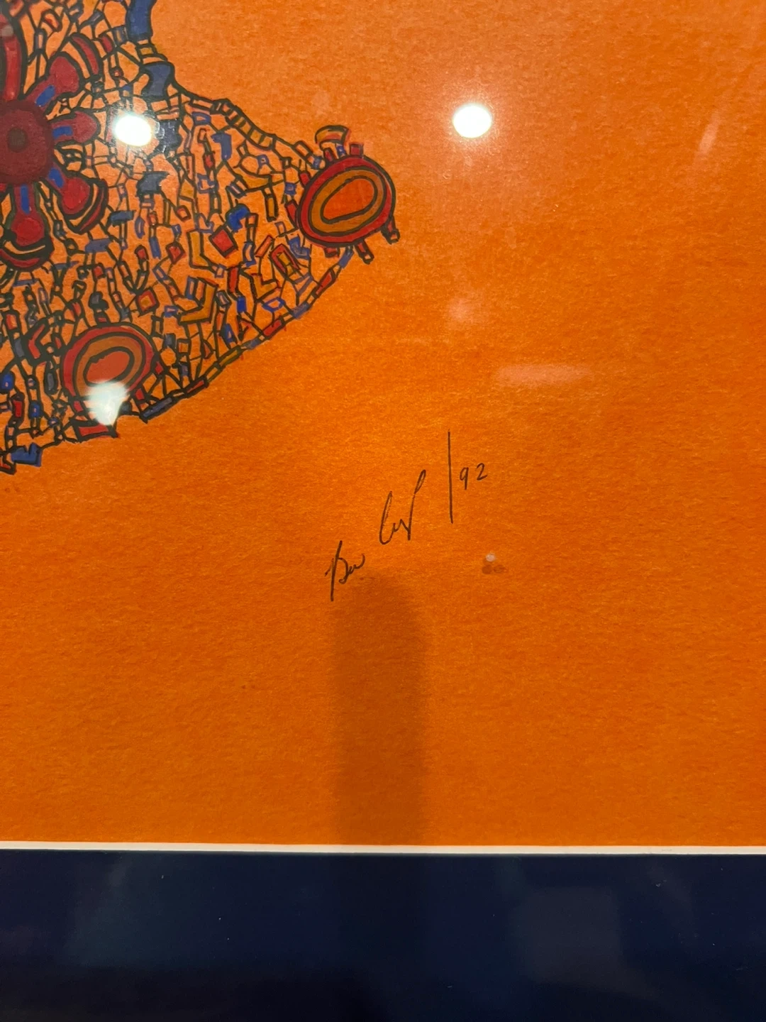 This is a unique piece of framed abstract art! The vibrant colours and intricate details make it a great addition to any room. The frame is in good condition and ready to hang
