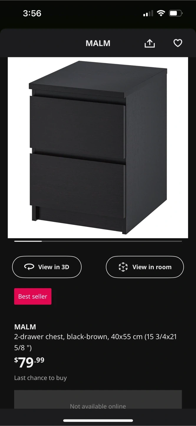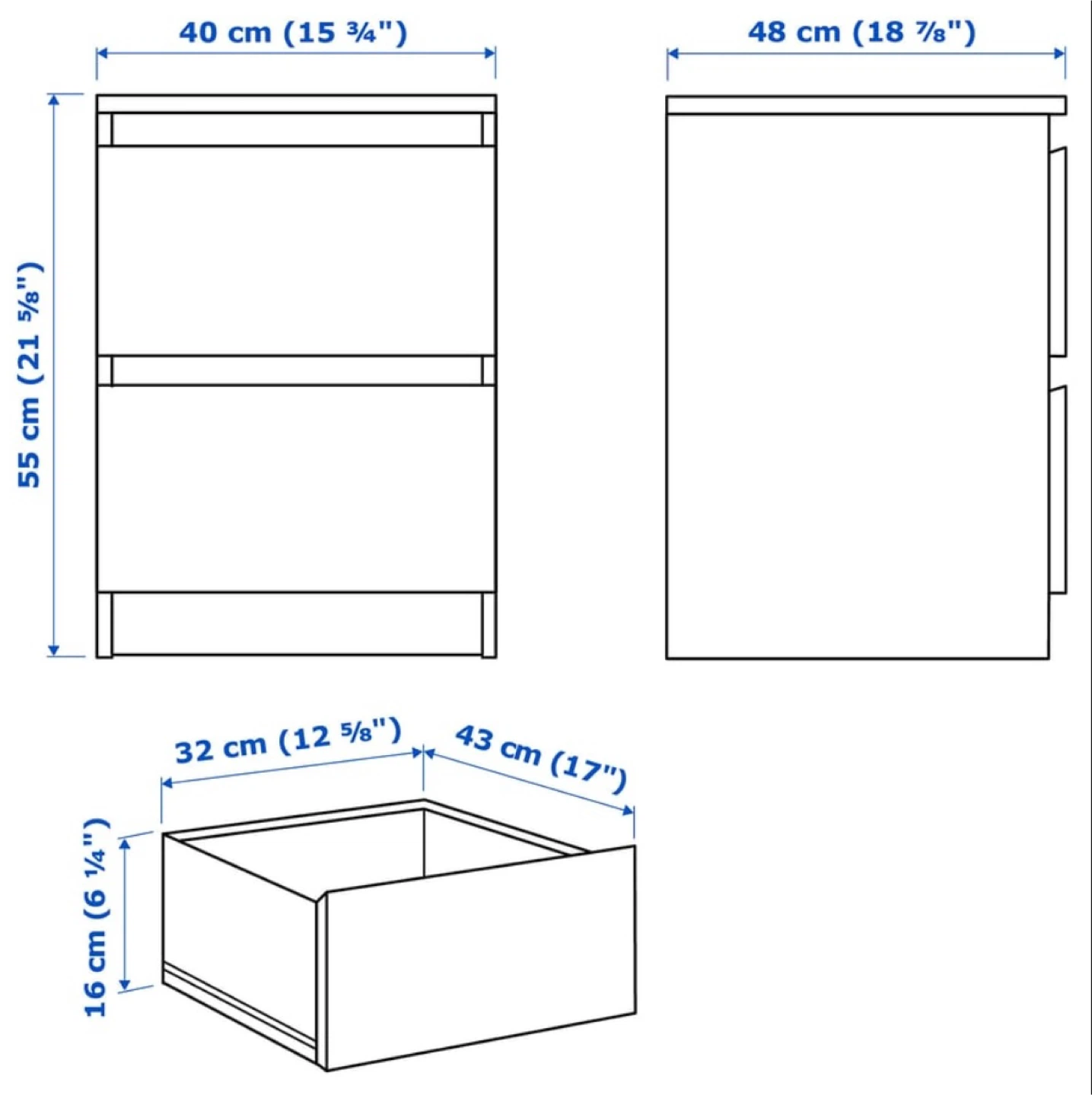 Selling two IKEA Malm two drawer nightstand in black with wood grain texture! They’re in great shape and ready for a new home. The dimensions are 40x55 cm (15 3/4x21 5/8 "). Originally bought for $79.99 each.