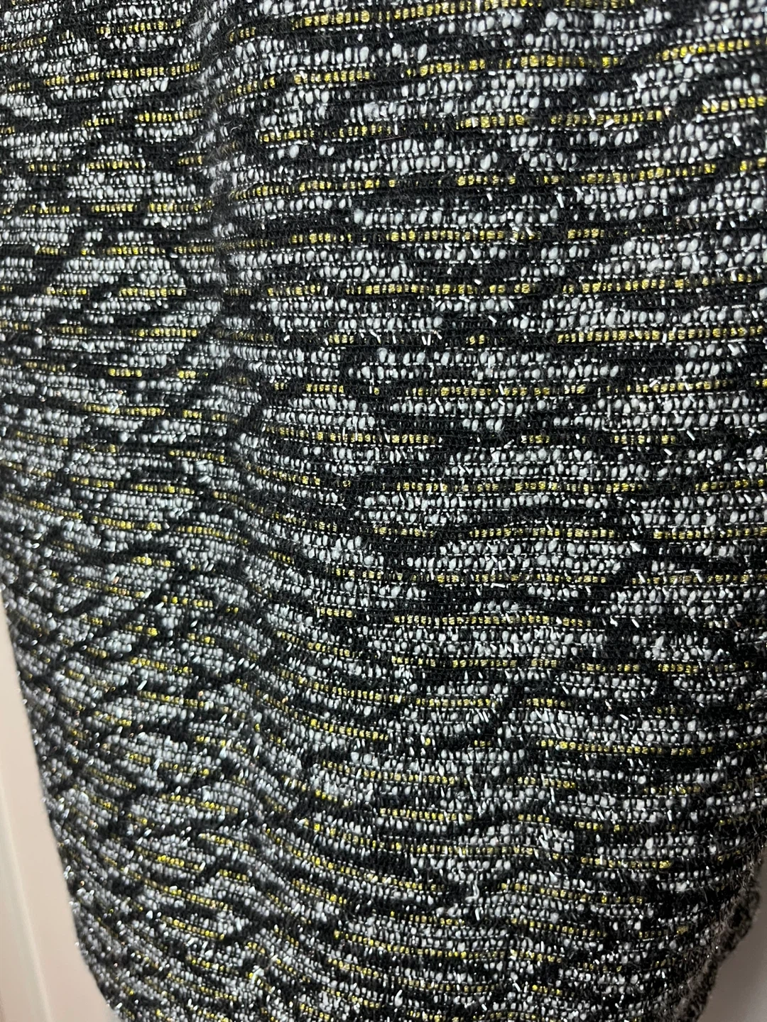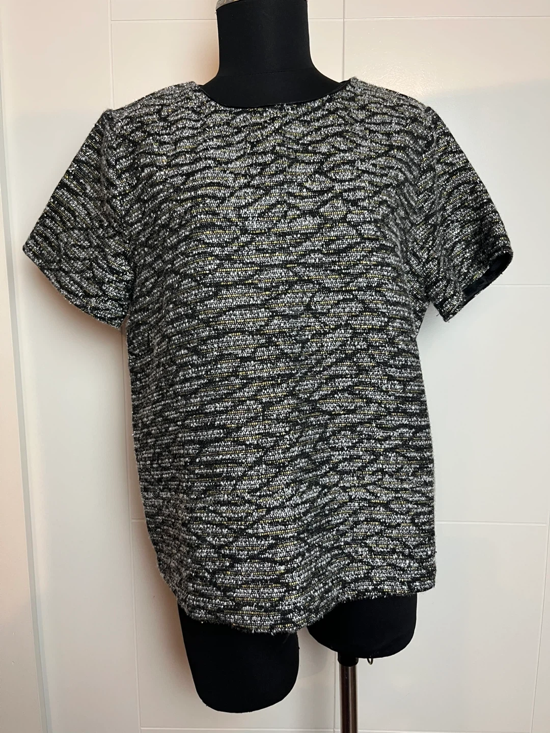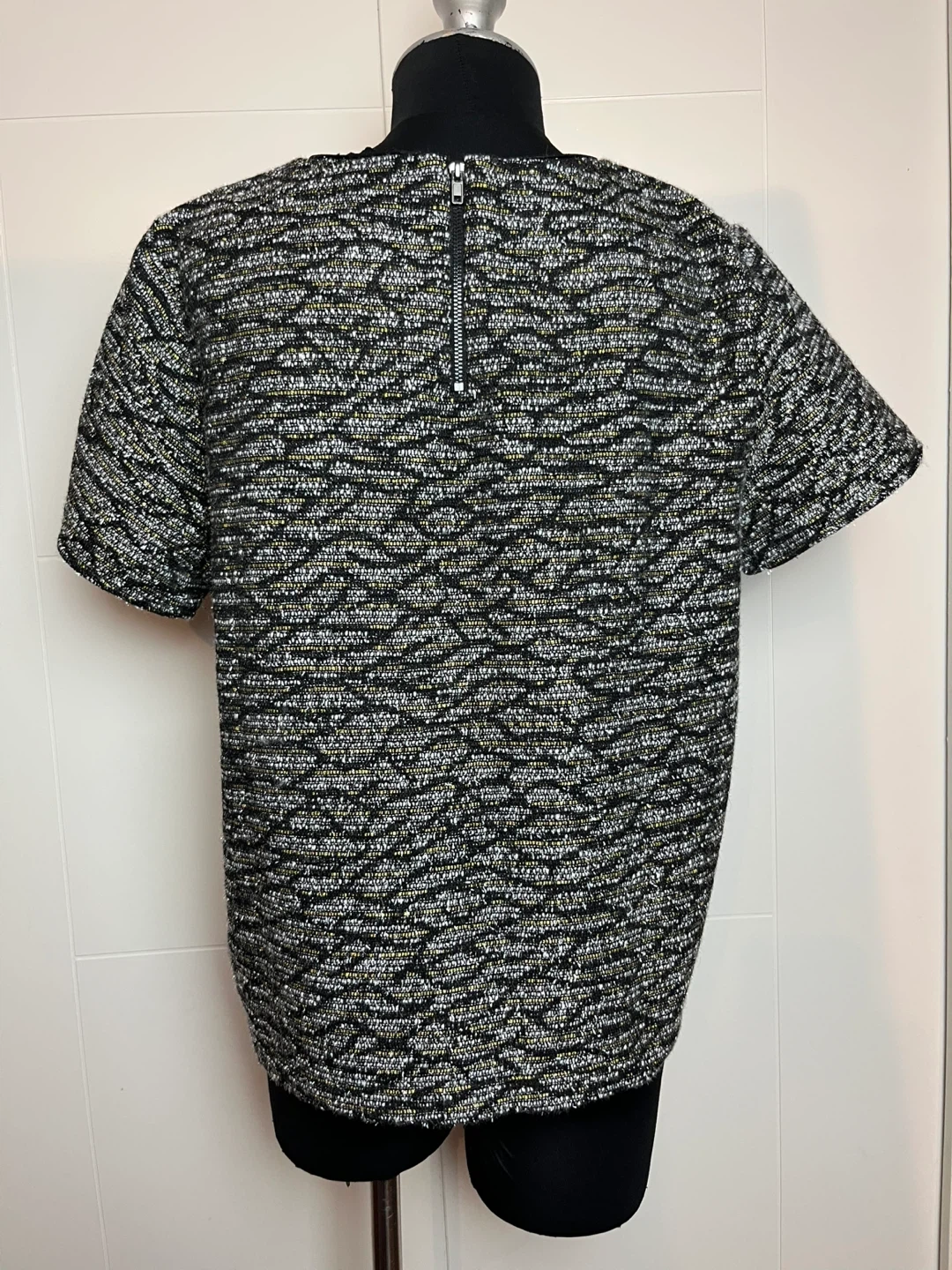 Here's a stylish textured short sleeve top that would be a great addition to your wardrobe! It features a unique pattern with black, white, and gold threads woven together. It has a zipper in the back.