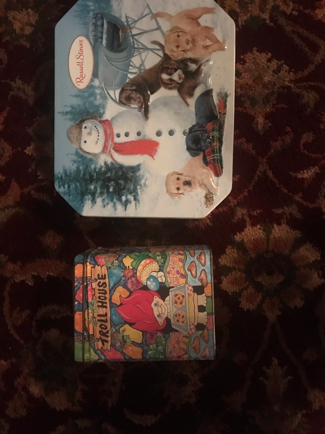 Two decorative tins for sale! One is a Russell Stover tin with a winter scene featuring dogs and a snowman. The other is a Troll House tin with a colourful troll design